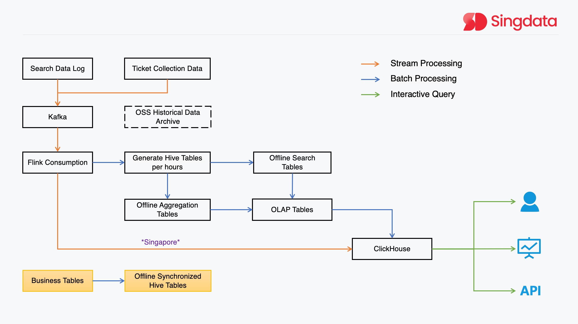Since the upstream data sources of ticket data and search logs are all uniformly summarized to Kafka, a program is developed to read data from Kafka and write one file to OSS every minute. Then, Sindata Studio's OSS data synchronization function is used to write the data to Lakehouse. In this process, the ODS layer retains the original JSON data, and the DWD layer completes the transformation of the JSON file format and subsequent aggregation. This solution meets the real-time scenario requirements of data freshness within 10 minutes from the source Kafka to the final data platform consumption end, and gradually approaches 5 minutes. Most importantly, the cost is far less than a resident real-time processing task. The interactive analysis scenario of multi-dimensional aggregation and associative query performance of 800 million data can meet the application-side requirements. Moreover, since data transmission is within OSS, avoiding "public network" network transmission, it also reduces overall storage and network transmission costs.