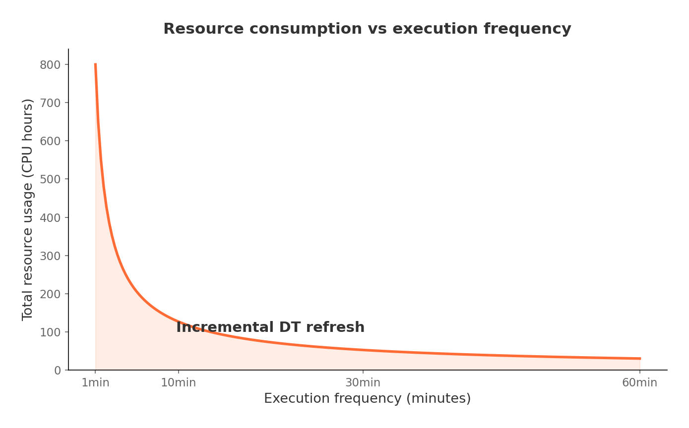 For complex workloads with heavy historical data involvement (joins against large dimension tables, for example), cost scales roughly inversely with the refresh interval. Refresh every 30 minutes and you pay more per day. Refresh every 90 minutes and you pay less than batch.