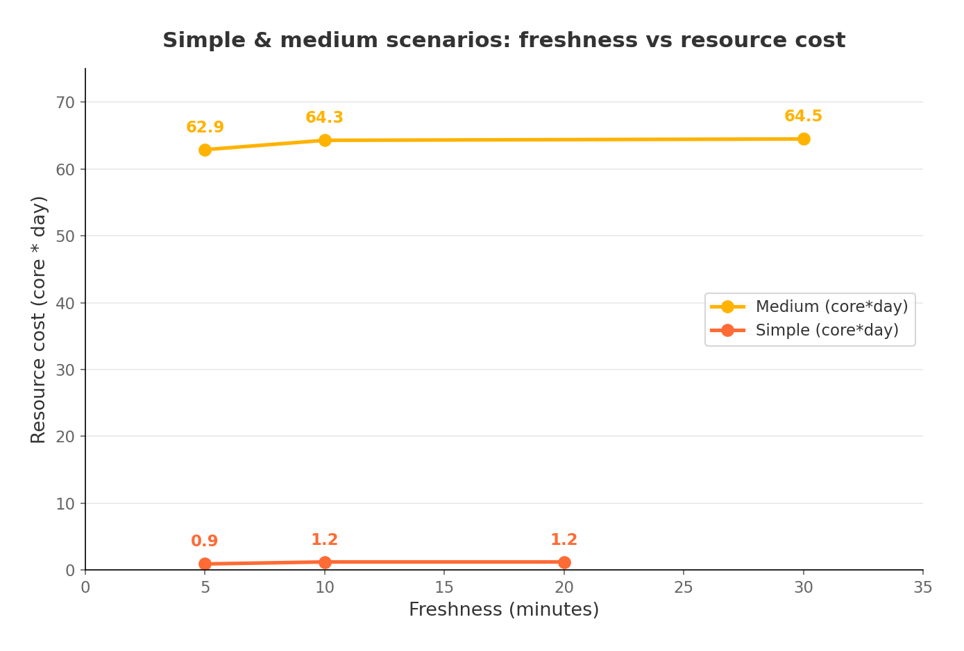 For simple and medium workloads, incremental computing hit 5-minute data freshness (and could go lower). Resource consumption was less than 1/20th of batch for the simple case and under 1/3rd for the medium case.