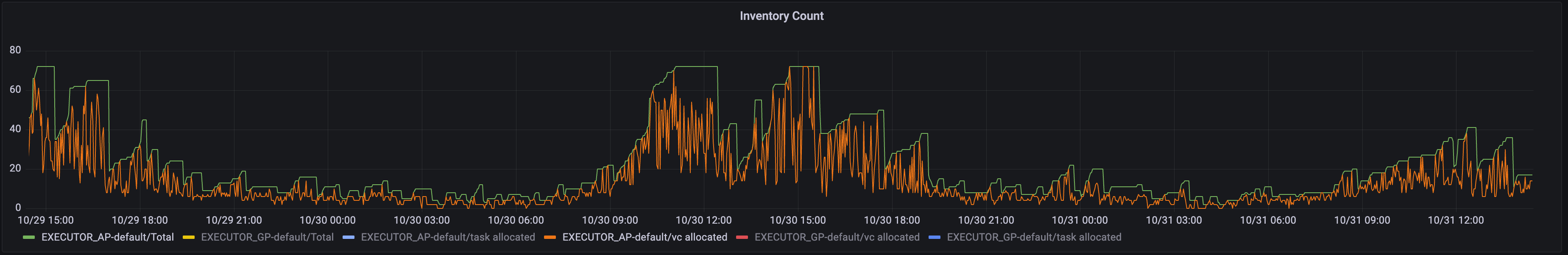 Green represents the purchased cloud resources (i.e. inventory), and orange represents the resources actually used by the virtual computing cluster