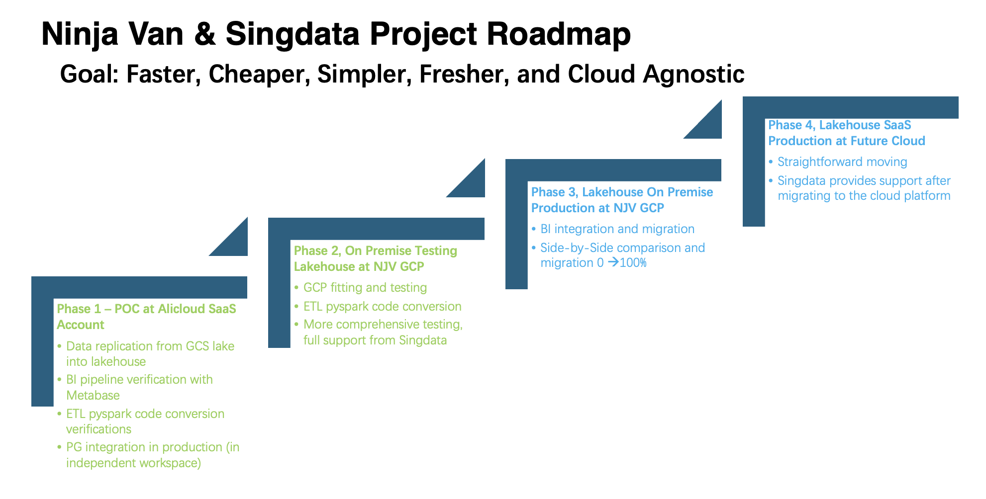 NinjaVan's Big data platform construction has gone through 10 years with the development of the enterprise, forming the current architecture based on open source self-built Spark+Flink+Presto+DataLake, which has problems of low performance, complex architecture, and high maintenance costs. When NinjaVan was thinking about the evolution of the next generation data platform, it considered exploring with Singdata. After PoC and partial production verification, a new generation architecture based on lake-warehouse integration, high performance, offline real-time integration was formed, and finally achieved a business effect of 6 times ETL performance improvement and 2x-10x BI performance improvement. The upgrade process fully considered the protection of original investment and low business risk, achieving compatibility mode introduction of new engines and seamless business switching.
