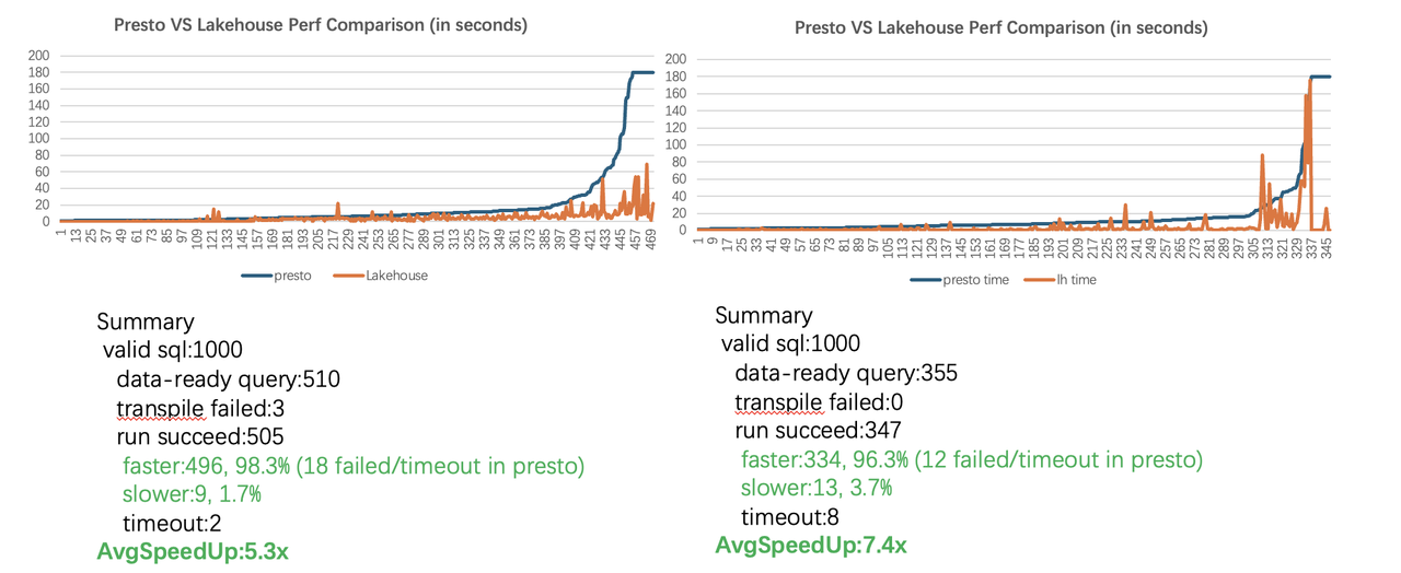 **In the BI scenario, **Singdata accelerated the lake BI online analysis query through ExternalSchema, achieving an average performance improvement of **5.3X times **and **7.4X times **respectively in randomly sampled 1000 query torture testing and 1000 query torture testing scenarios with similar patterns. The overall performance is improved by 2-10X times compared with the original Presto query scheme