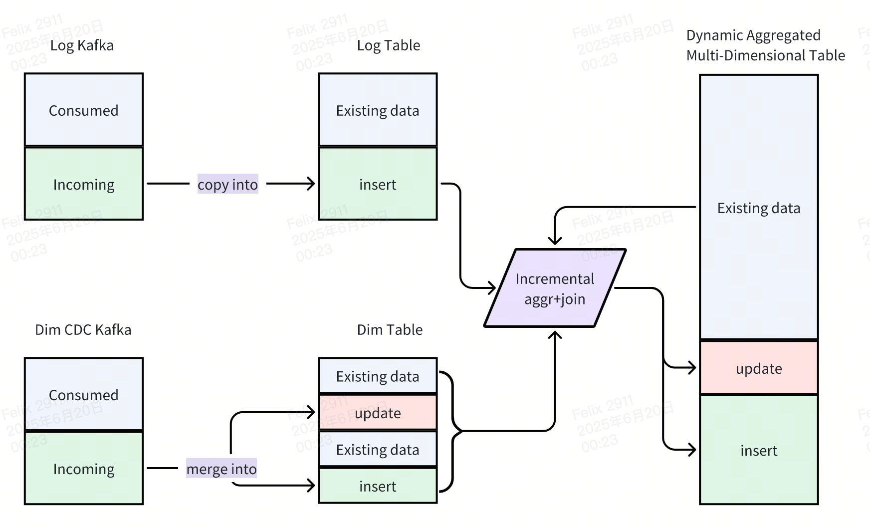 Real-time user dimension tables divide into real-time and offline dimensions through partial update methodology. For dimensions requiring real-time updates, we read user real-time Kafka data streams, performing 1-minute scheduled updates on user dimension table data to achieve real-time refresh effects. For daily-updated dimensions, we use offline scheduled writes, identifying records requiring updates through table timestamp evaluation to implement on-demand updates.