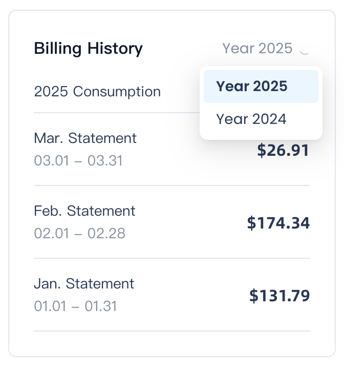 Billing History provides a summary of all billing records. By default, monthly aggregated data for the current year is displayed. Use the year selector to view historical billing data.