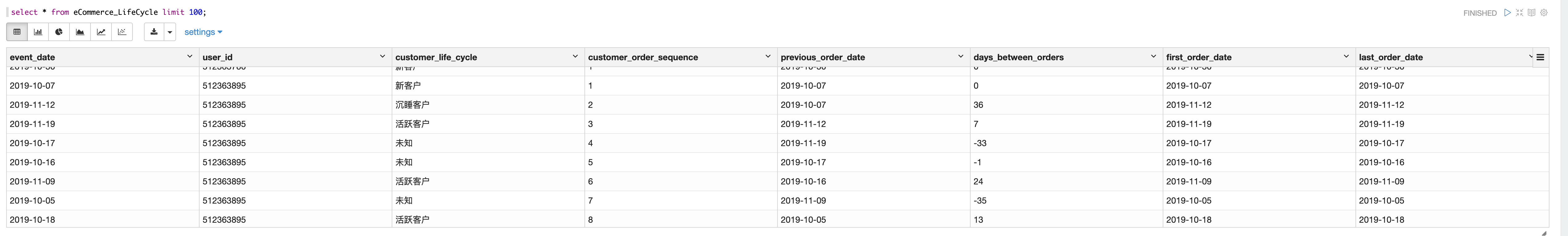 The next query uses a CASE statement to create an additional customer_life_cycle column to indicate whether the order is from a new customer, an active customer, or a lapsed customer based on the days_between_orders column. In this example, if the order occurs anytime between 1 to 365 days from the previous order, the customer is considered active; if the previous order exceeds 365 days, the customer is considered lapsed. This is highly business-specific, so yours may vary.