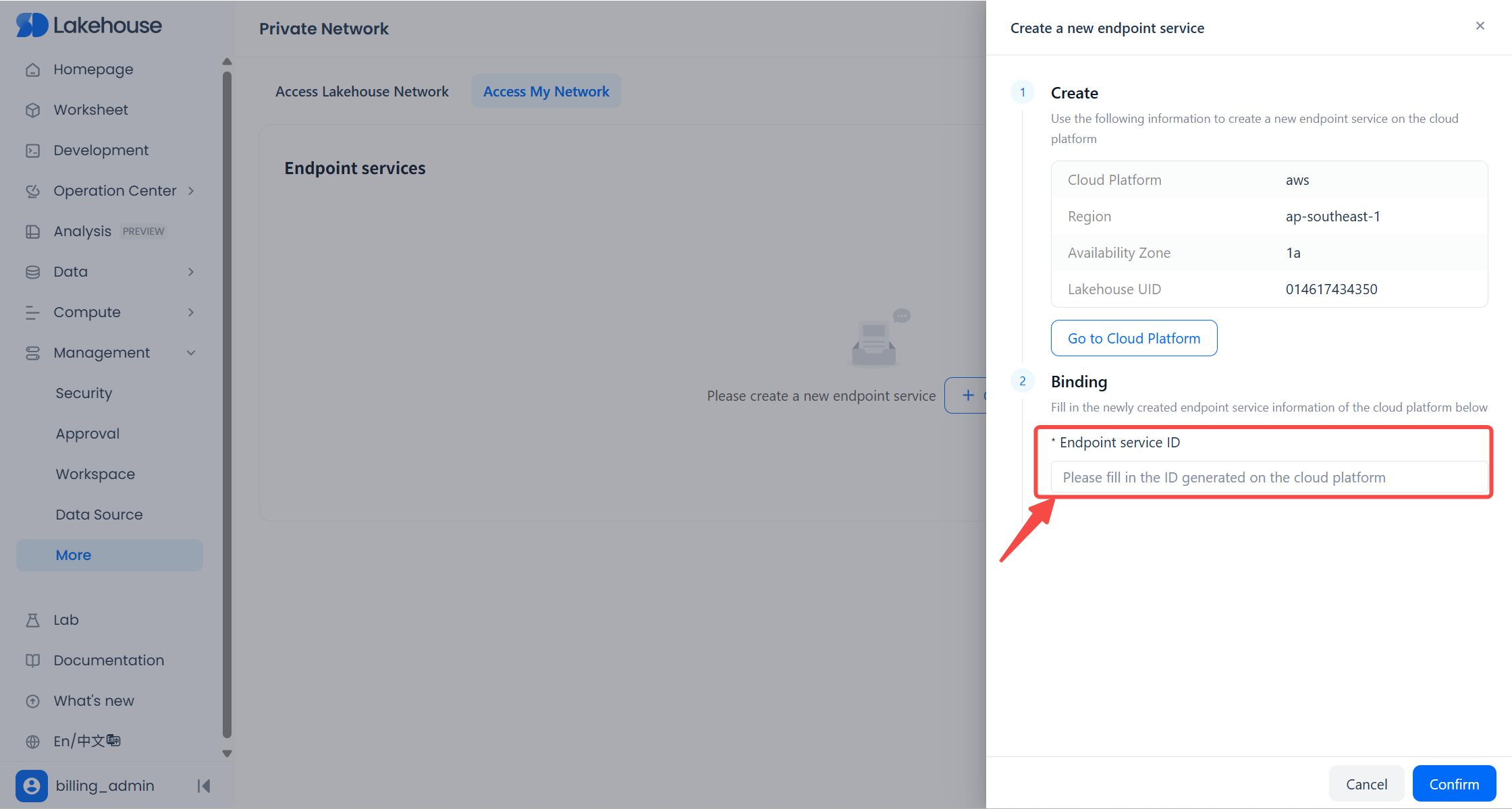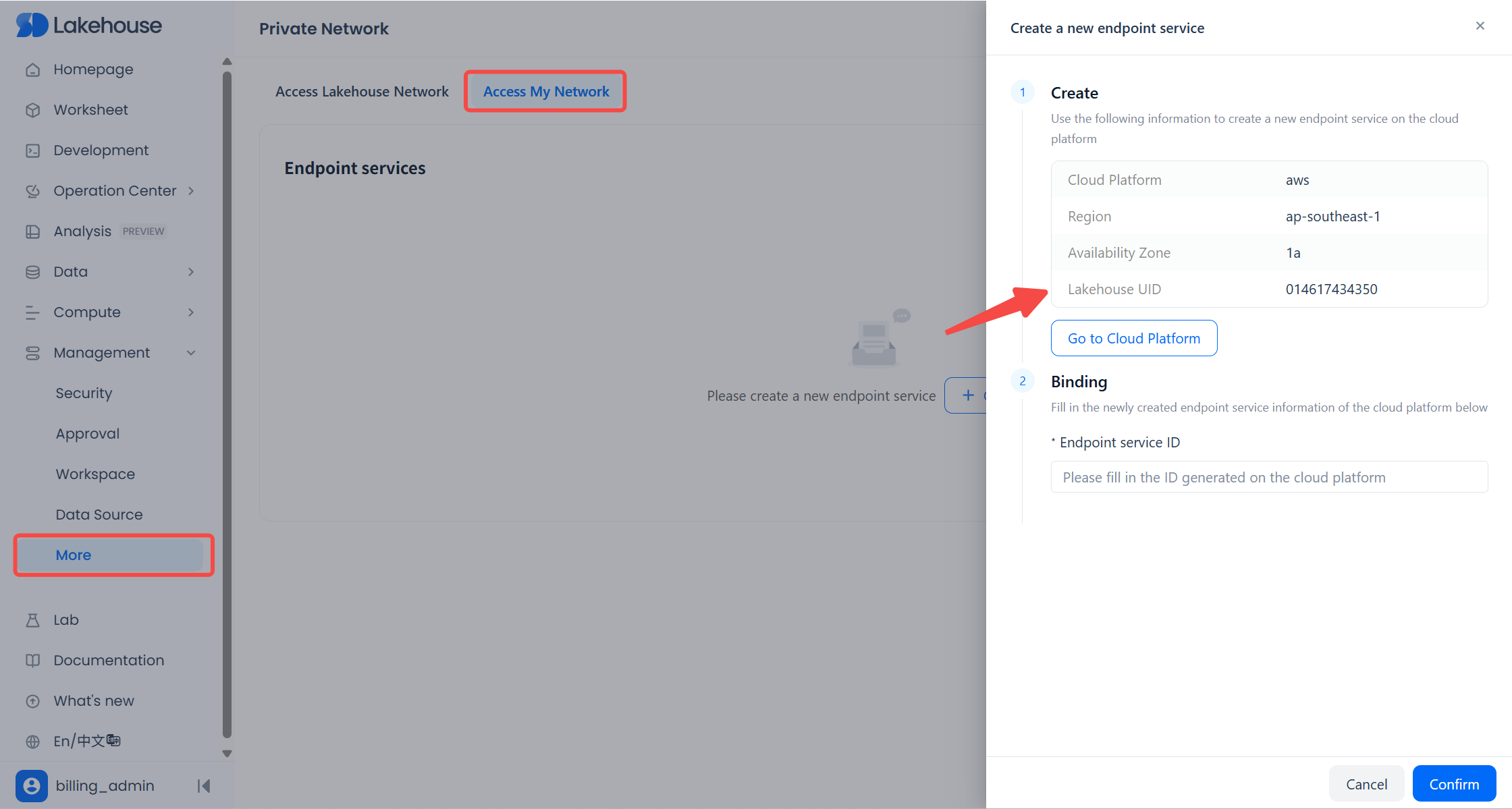 In Lakehouse, navigate to Management → More → Private Network → Access My Network, and click Create. At the top of the Lakehouse “Create Endpoint Service” dialog, locate the region and availability zone (AZ) of your current Lakehouse service instance.