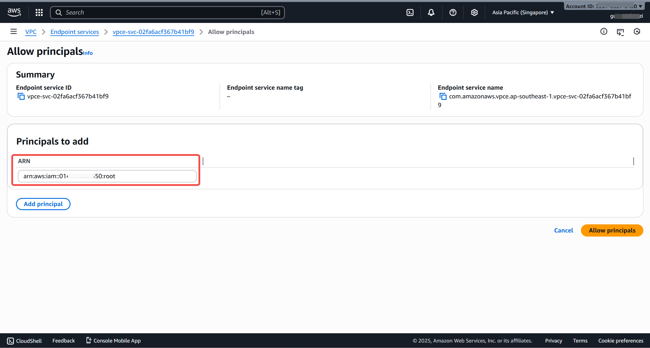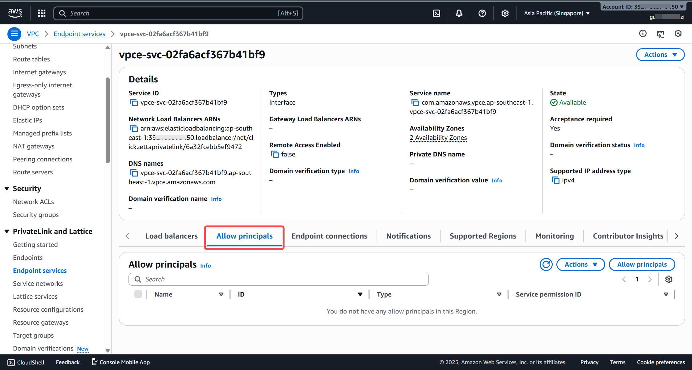After the endpoint service is created, go to the Allowed principals tab and add the Lakehouse ARN.