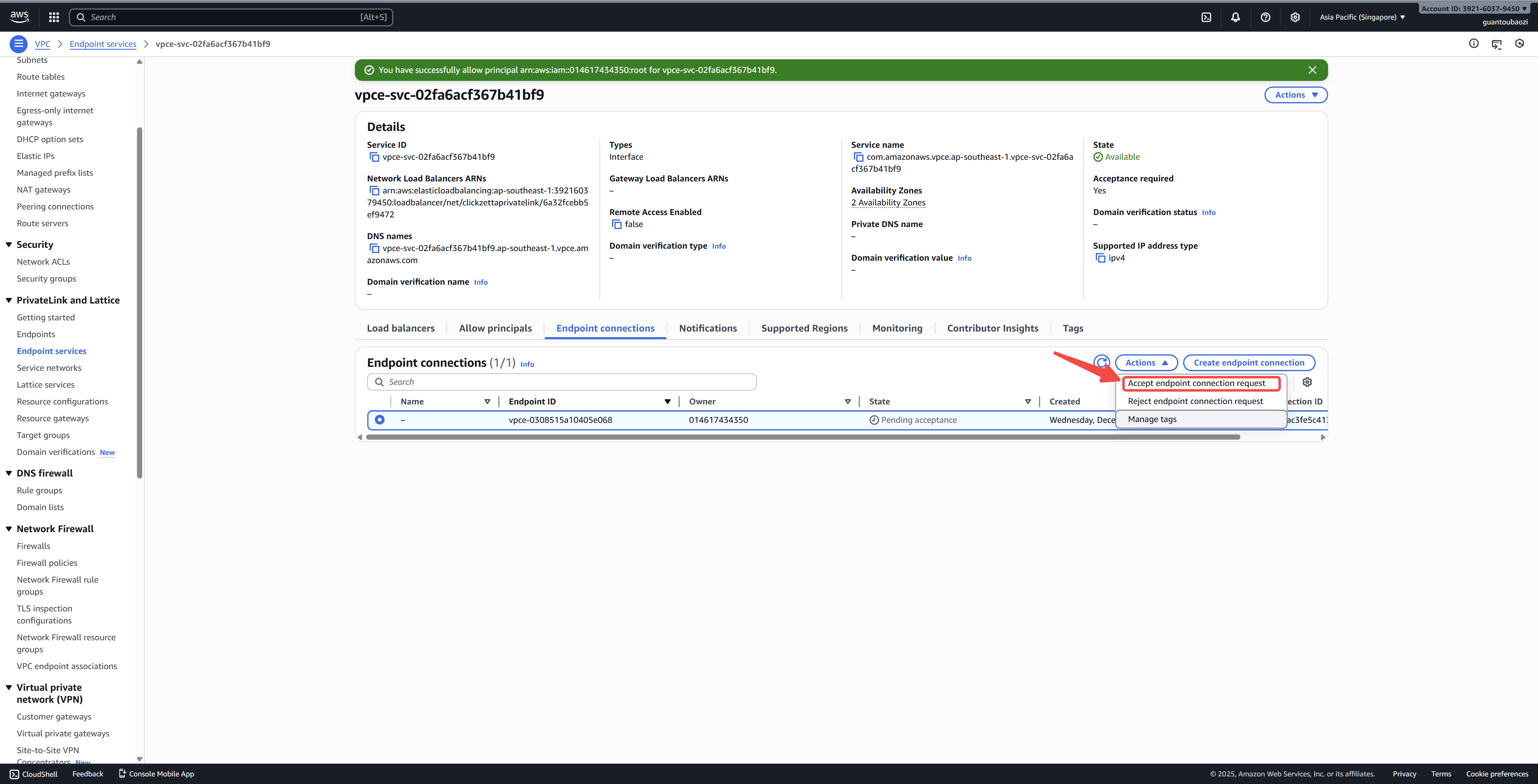 Select the pending connection request, then click Actions → Accept endpoint connection request.