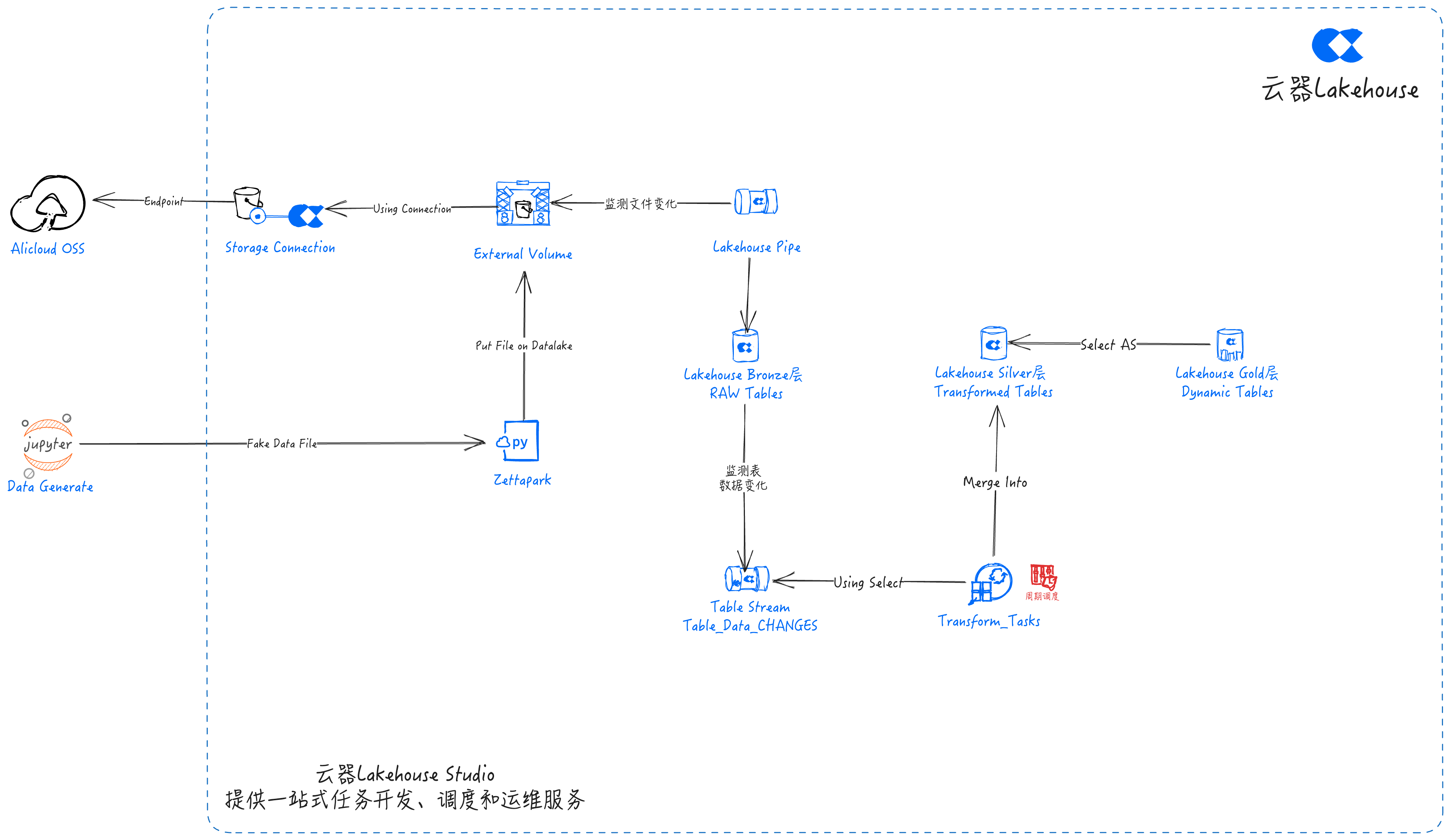 The Bronze layer focuses on ingesting data from Alibaba Cloud Object Storage Service (OSS) into Singdata Lakehouse. This is done by creating a data lake Connection and External Volume, as well as Lakehouse Pipe and Table Stream. At this stage, the location of the data in Alibaba Cloud OSS is specified in the External Volume. Using External Volume, data can be automatically ingested into Lakehouse tables in real-time using Lakehouse Pipe.