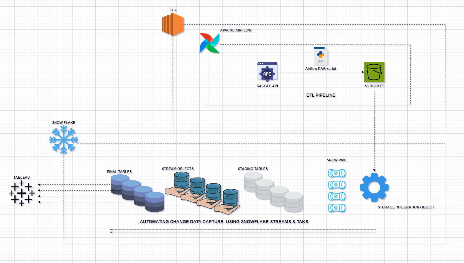 After developing the project, you can schedule the Airflow DAG to run as needed, ensuring that the ETL process executes at the desired frequency. The final cleaned, normalized, and transformed data will be available for real-time visualization in Tableau, providing up-to-date insights and reports. The project architecture diagram is as follows: