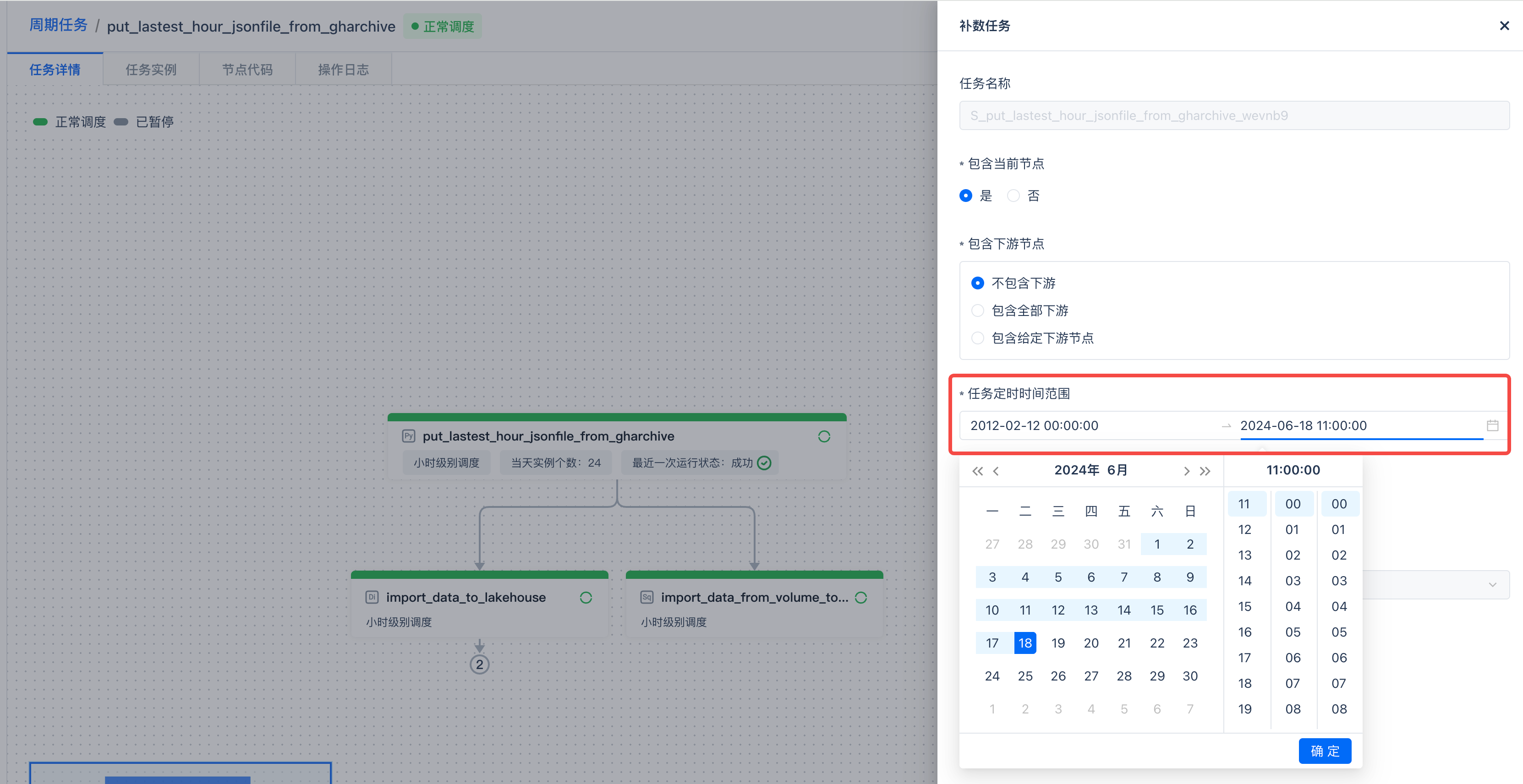 The periodic scheduling of this task starts at 11:00 on 2024-06-18, so set the end time of the backfill task to 2024-06-18 11:00:00.
