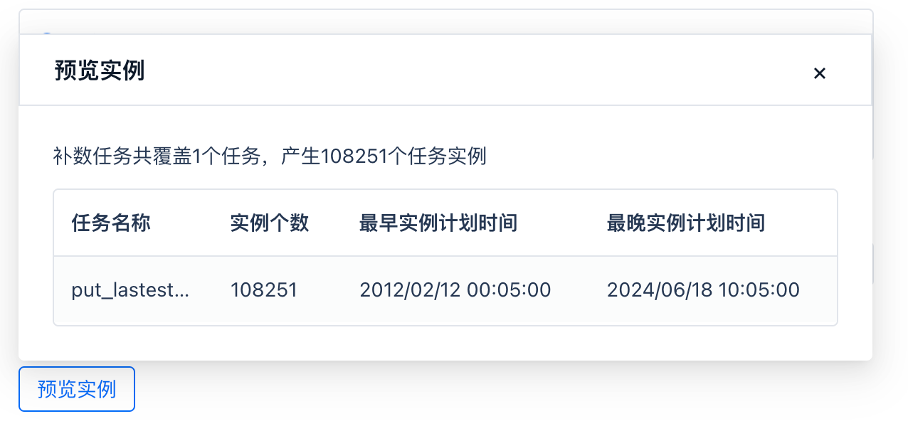 Preview the instances of the backfill task. A total of 108251 task instances will be generated, which means there are 108251 hours in the above time period, and this backfill will synchronize 108251 files from the gharchive website to the cloud object storage.