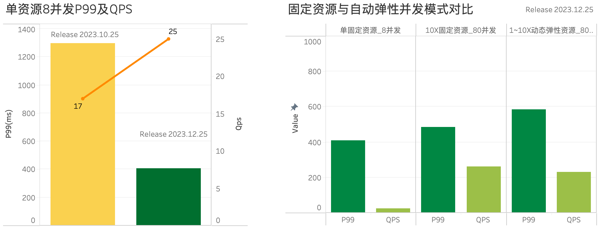 In multi-concurrent scenarios, resource scheduling has been significantly enhanced, improving concurrent query performance and performance stability during elastic scaling. Compared to the Release 2023.10.25 version, the QPS of a single resource instance on the SSBFlat 1G dataset increased by 47%, and the P99 query latency decreased by 68%. Additionally, in the automatic horizontal elastic scaling (Concurrency Scaling) mode, the P99 and QPS performance metrics of multi-concurrent queries further approach the performance of fixed resources planned for peak values, effectively reducing resource costs.