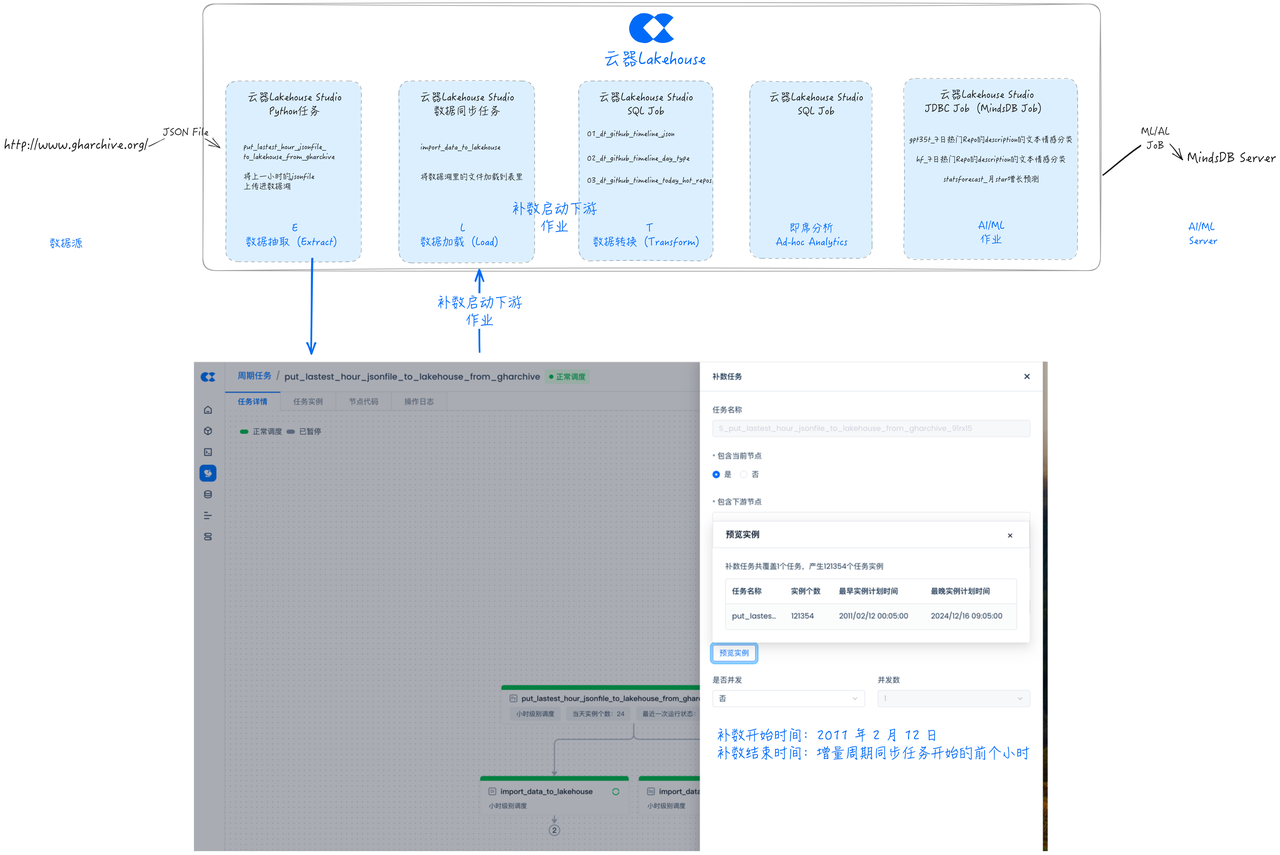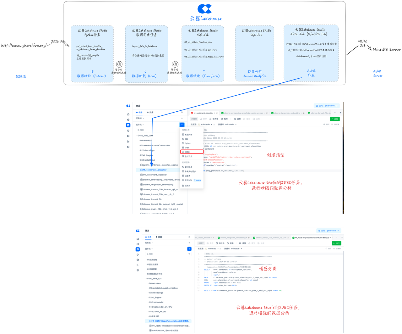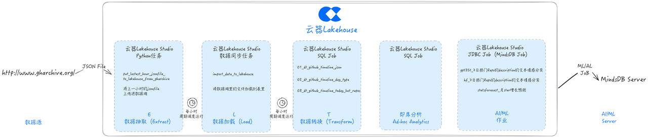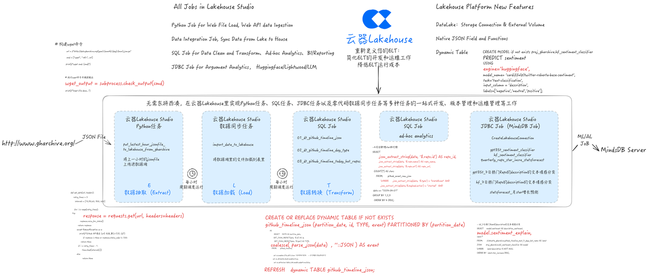 - Application Case: Using GHArchive data as an example, it demonstrates data extraction, loading, cleaning and transformation, ad hoc data analysis, AI/ML enhanced analysis, incremental synchronization task scheduling, full data supplementation, and task operations and maintenance.