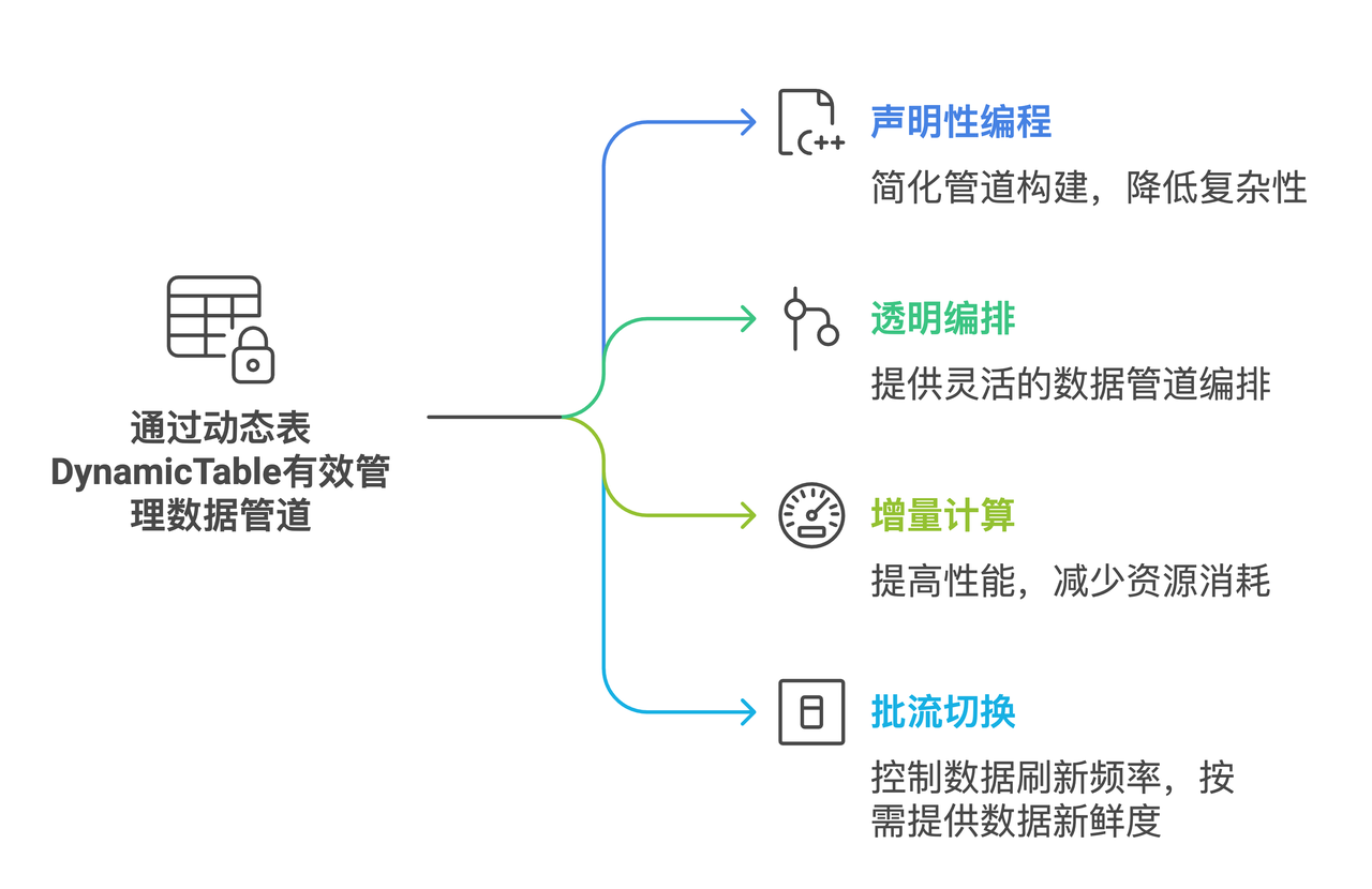 - Dynamic Table: Features declarative programming, transparent orchestration, incremental processing, easy switching, and observability.