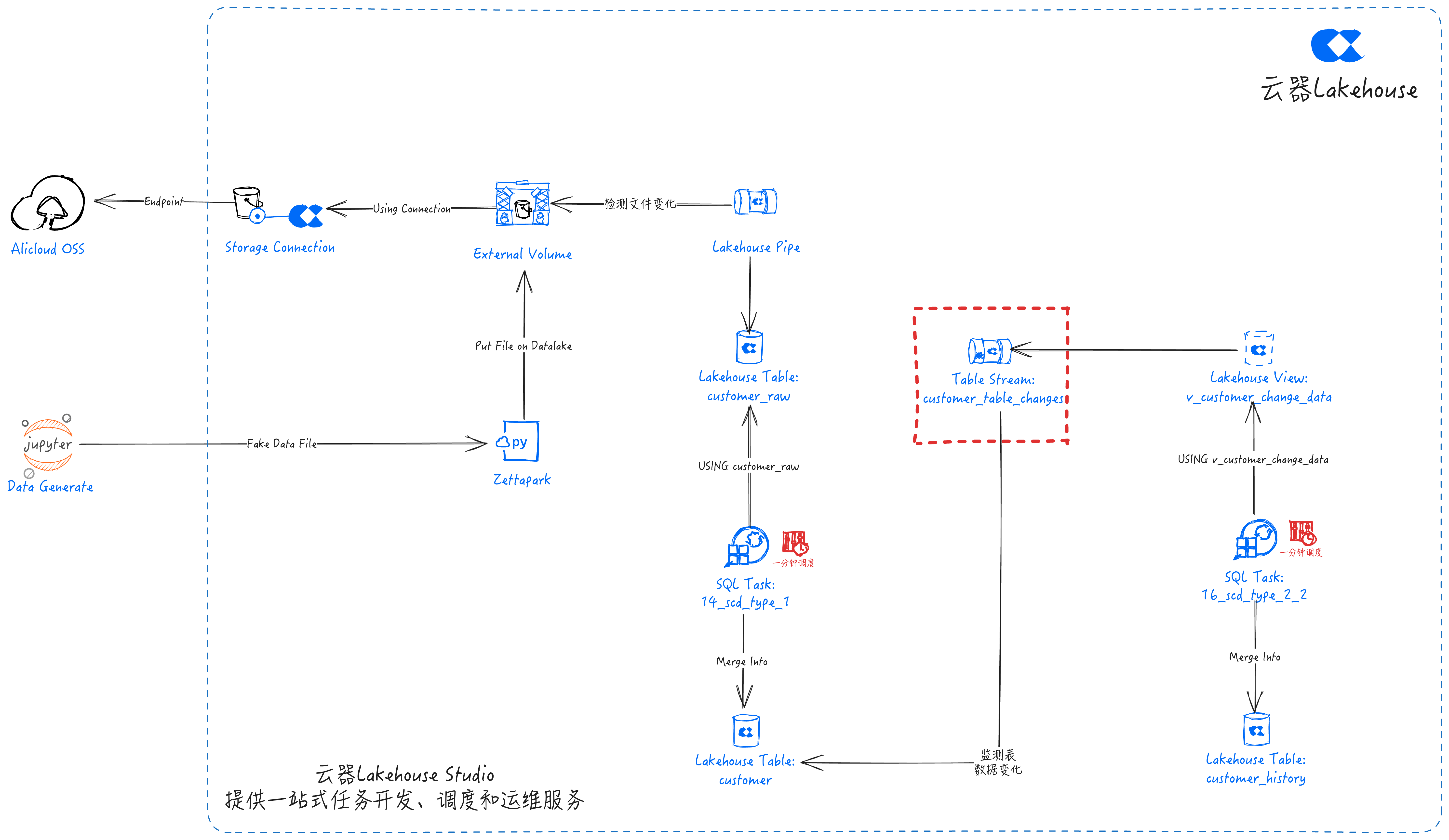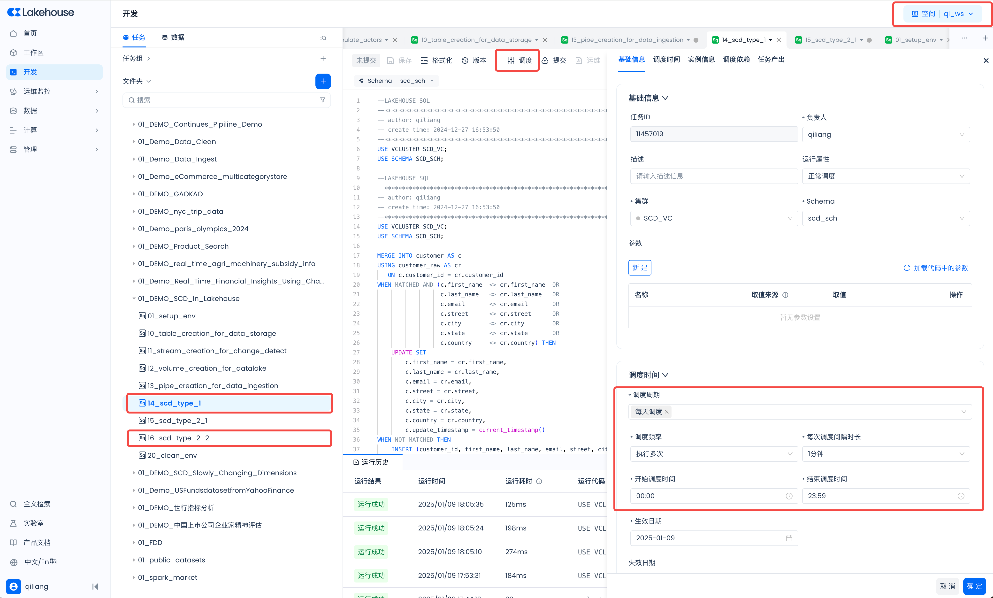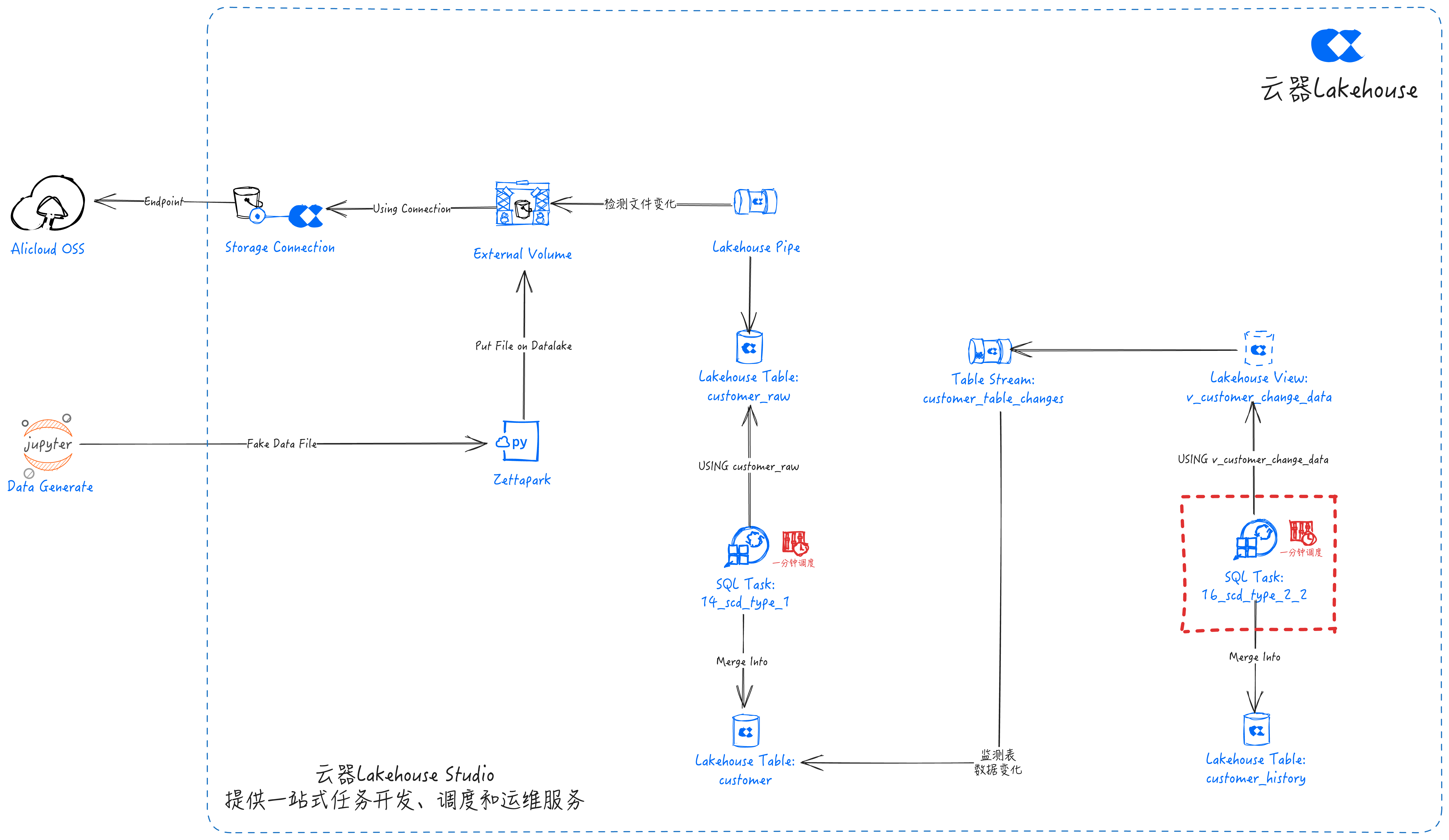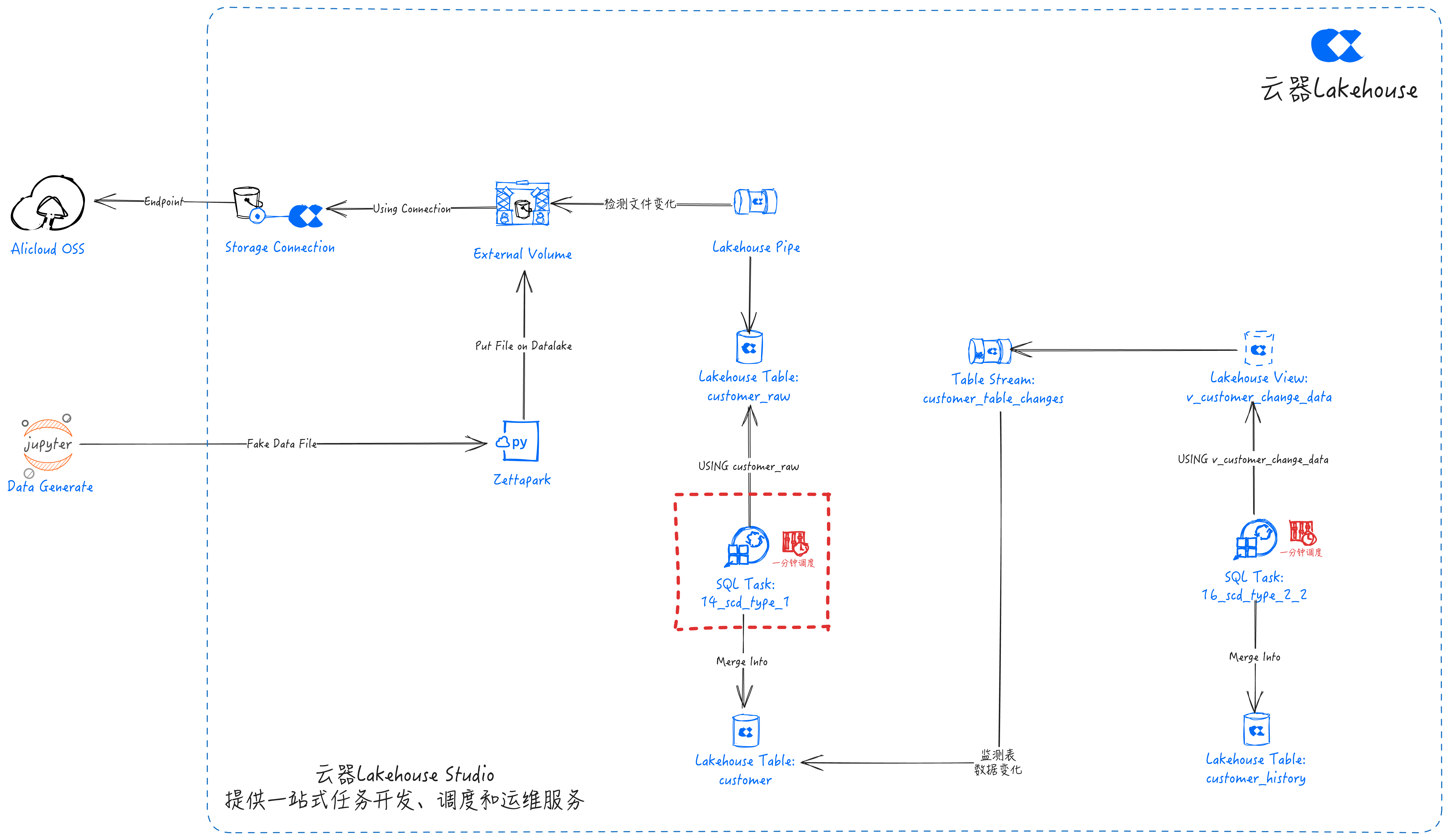 SQL Tasks for SCD processing → Develop SQL tasks to implement SCD processing logic and schedule tasks through Singdata Lakehouse Studio.