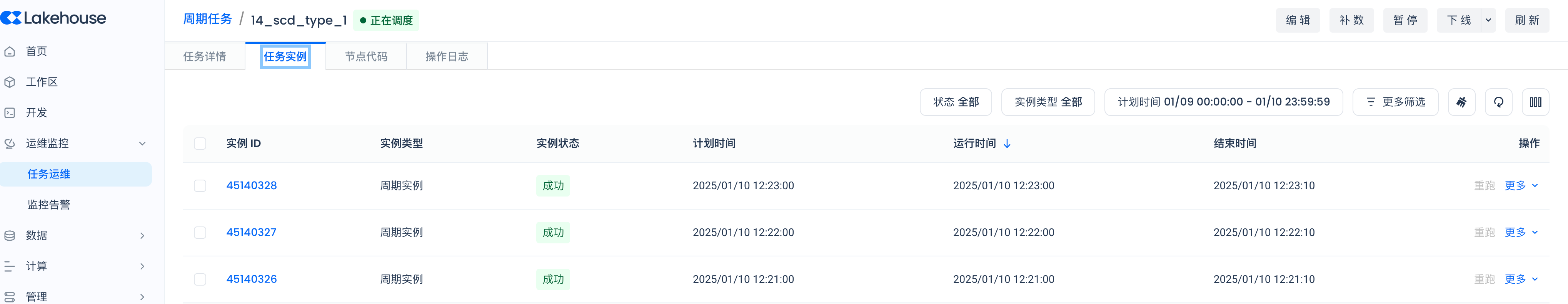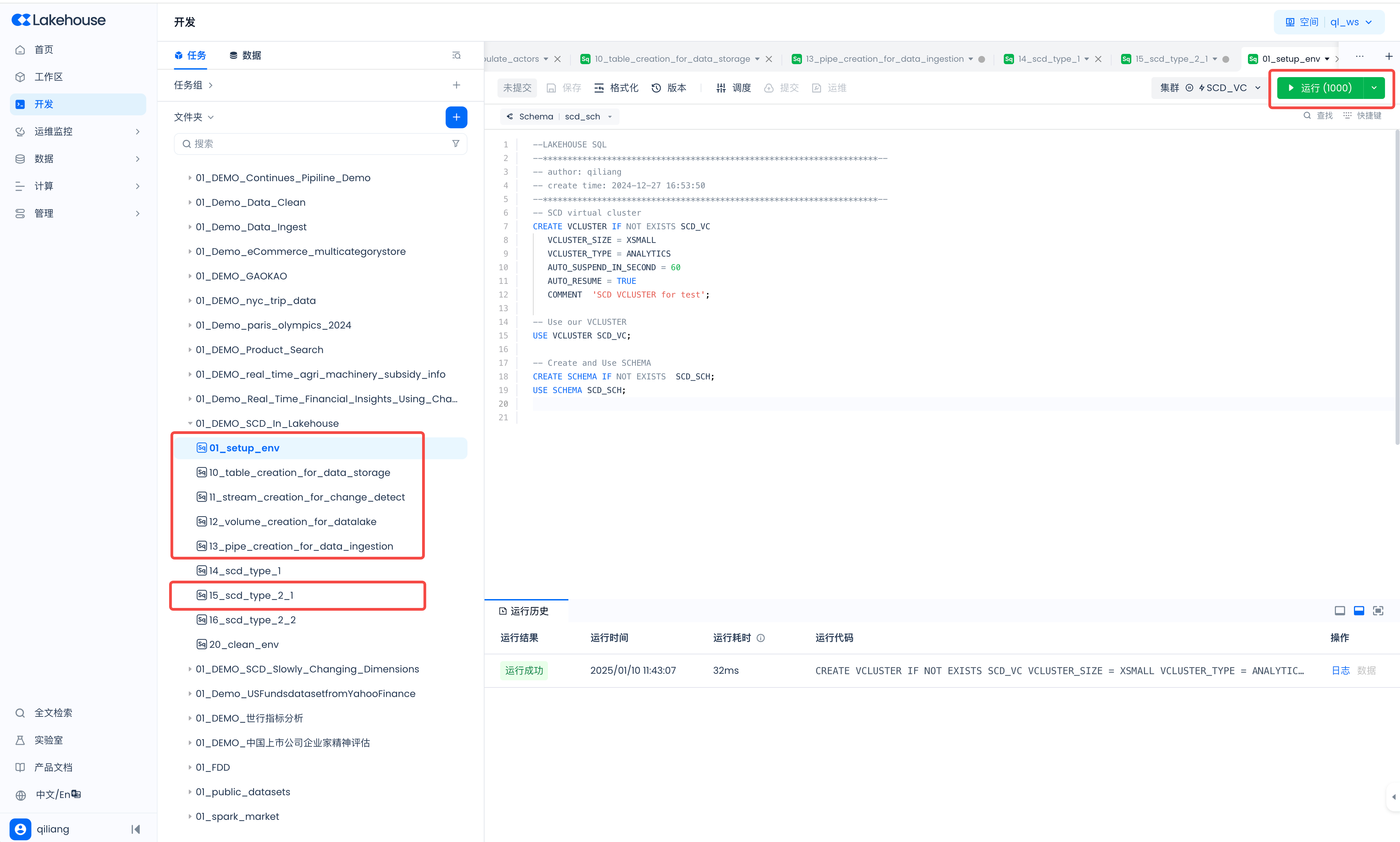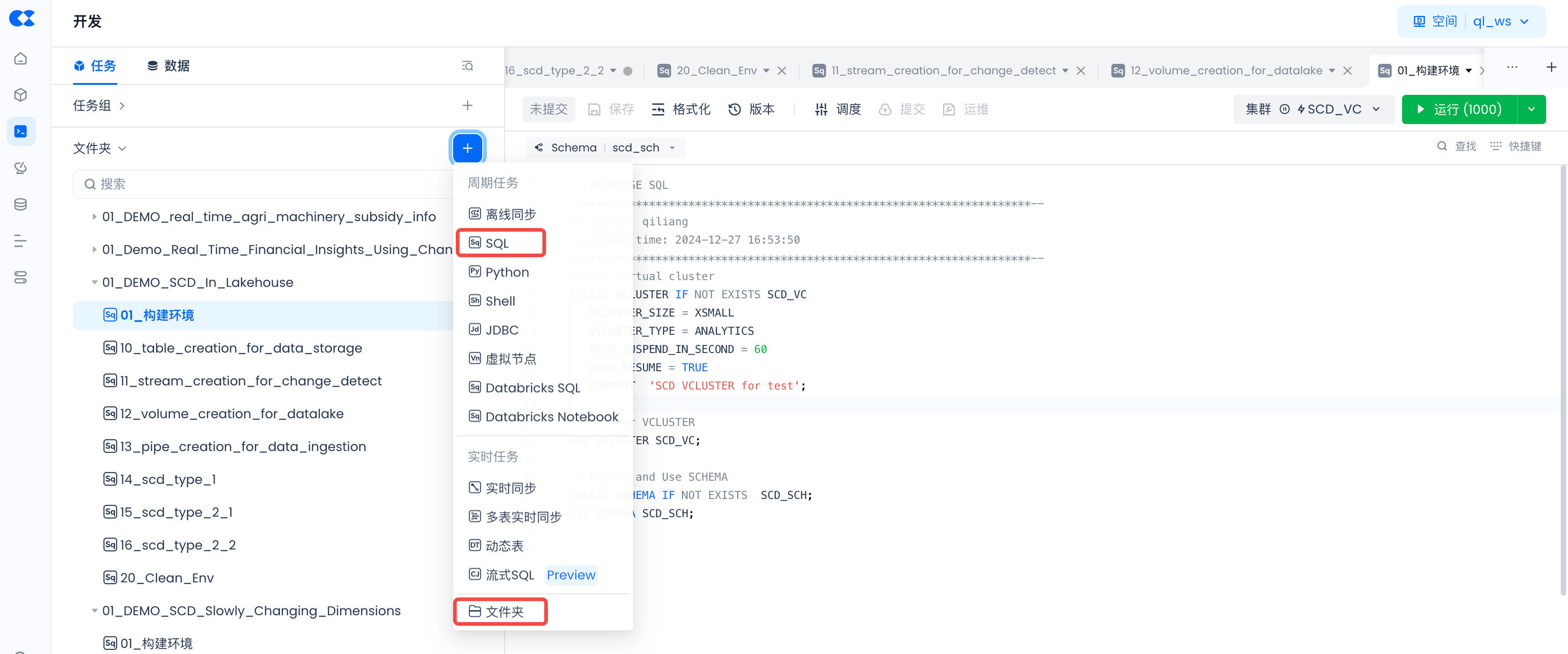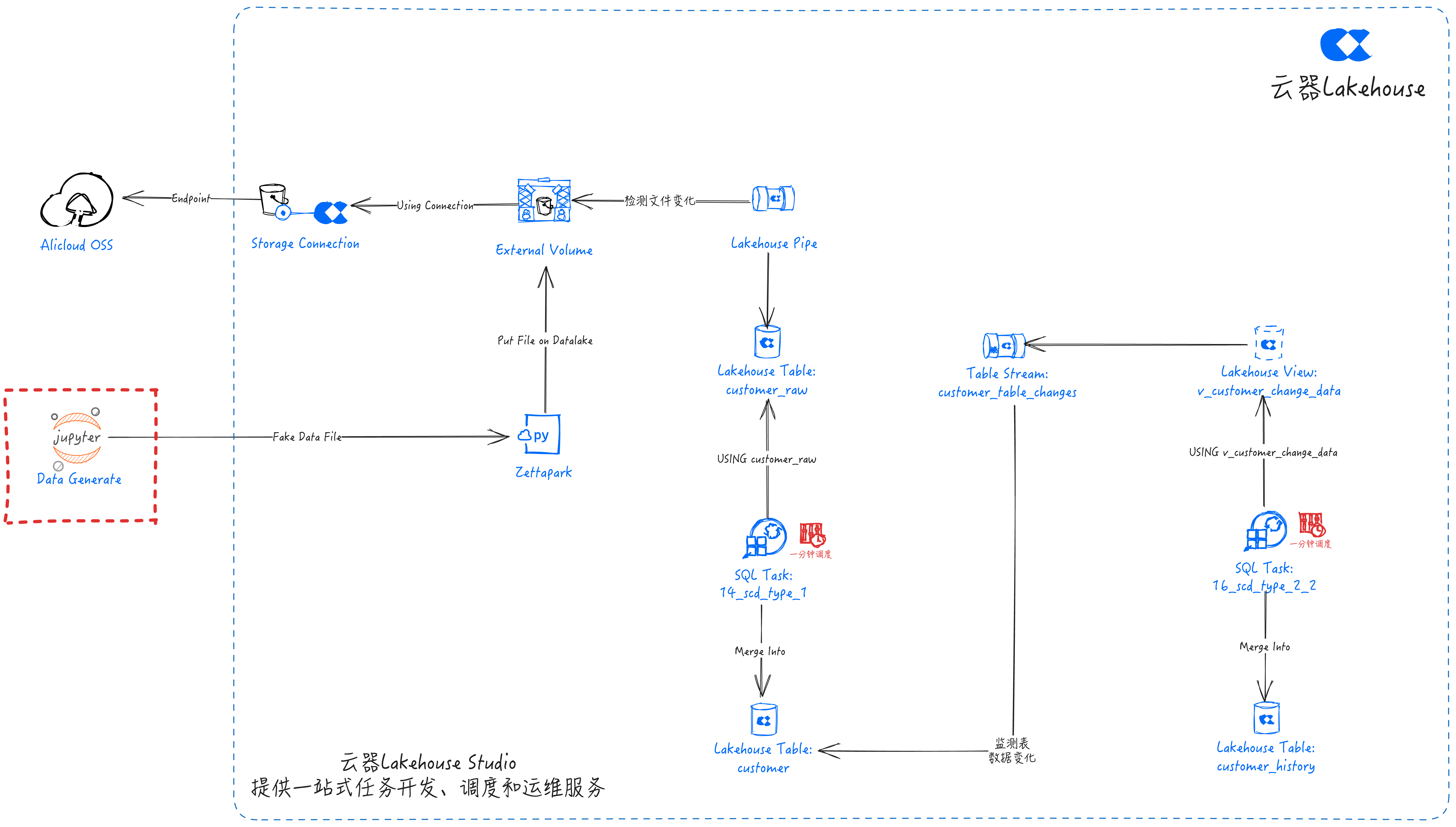 SQL Tasks for SCD processing → Develop SQL tasks to implement SCD processing logic and schedule tasks through Singdata Lakehouse Studio.