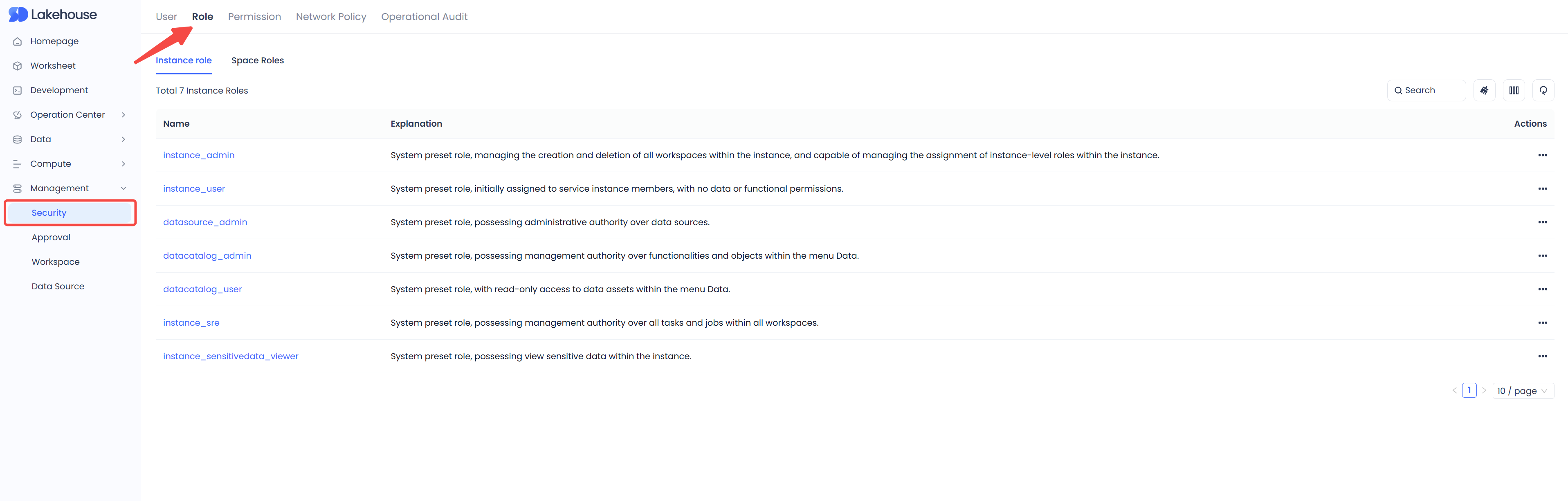 On the "Security" - "Roles" page, you can view the service instance-level roles and workspace-level roles under the current instance.