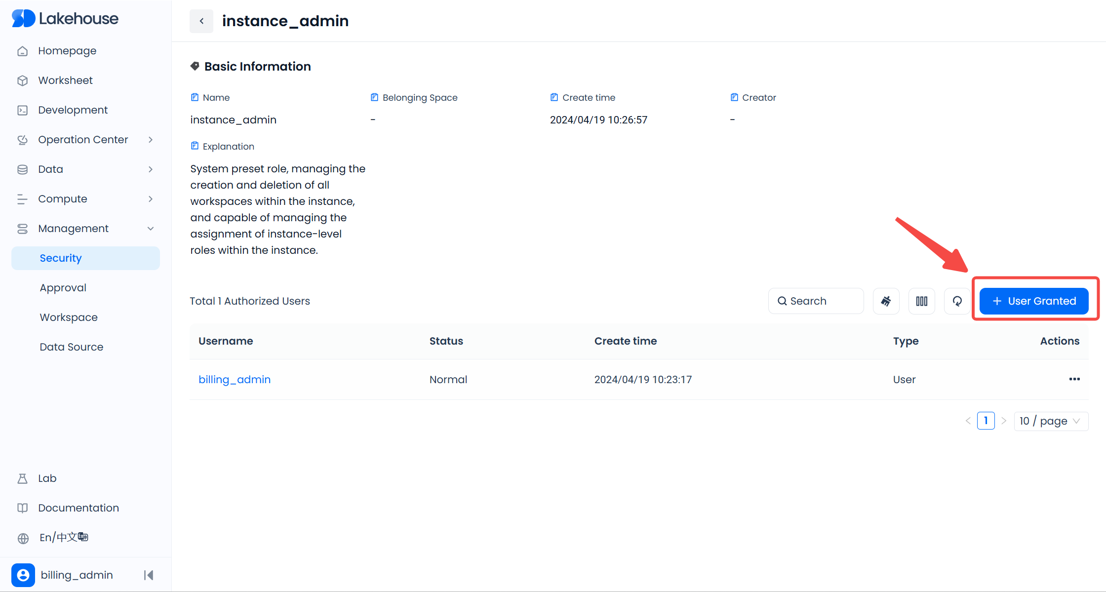 In Singdata Lakehouse, the user who creates a service instance is by default assigned the "instance_admin" role. To ensure that at least one user can perform instance-level management tasks (such as creating workspaces and managing instance-level roles), you must retain at least one user when removing a user granted the "instance_admin" role, otherwise, you will receive an error message. It is recommended to assign at least one more user as an instance administrator to avoid impacts due to user unavailability or other special circumstances.