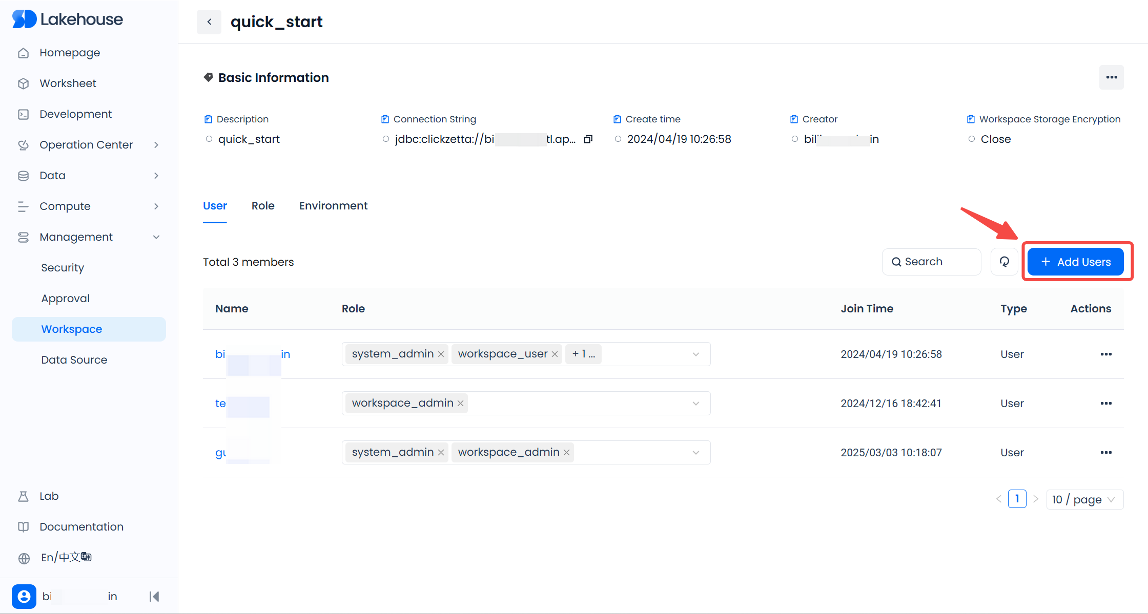 A user needs to join a specified workspace to use the Virtual cluster (Vcluster) and execute SQL within that workspace. Workspace administrators can add specified users to the workspace in the following two ways: