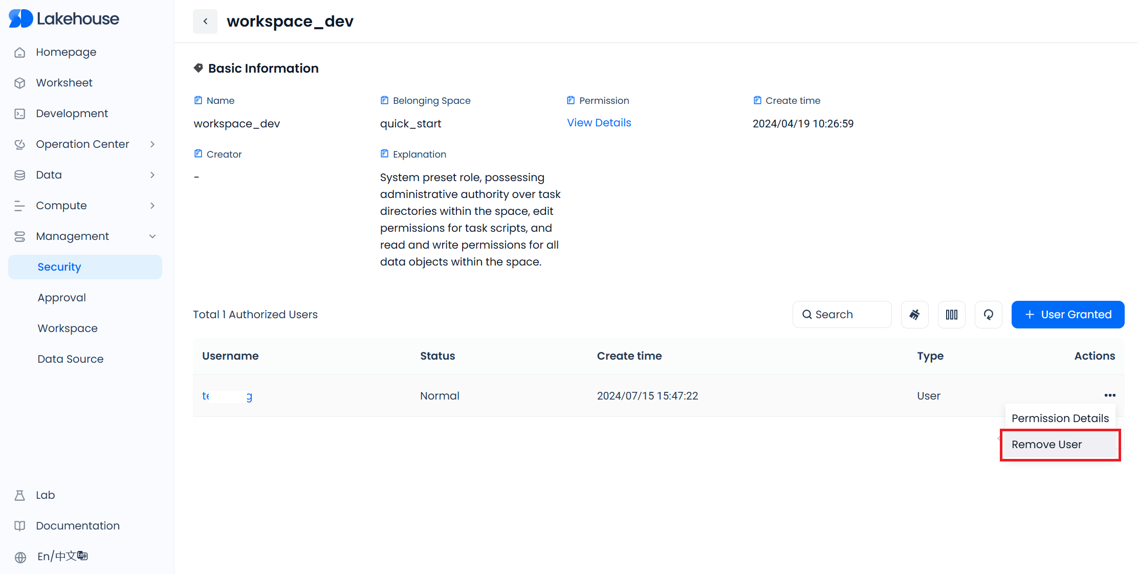 In the "Users" list of the workspace, click the "..." in the operation column on the right side of a user, and select "Remove User" to remove the user from the workspace. The removed user will immediately lose the granted workspace roles and the permissions to use the Virtual cluster (Vcluster) and execute SQL within that workspace.