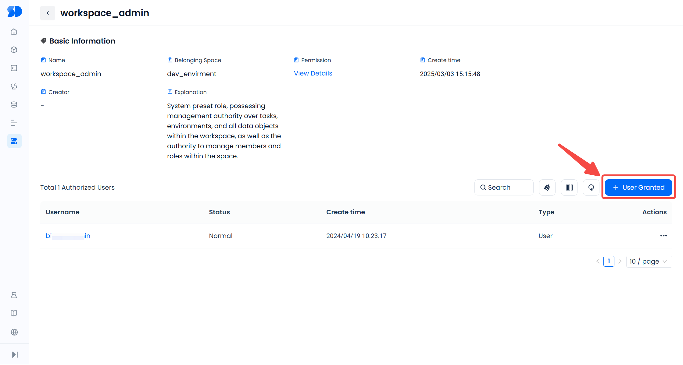 To authorize any role, click the role name to enter the role details page, where you can view all users who have been granted the role. Click "+User Grant," select the users to be added in the pop-up window, and click "Authorize" to grant the role to the users.