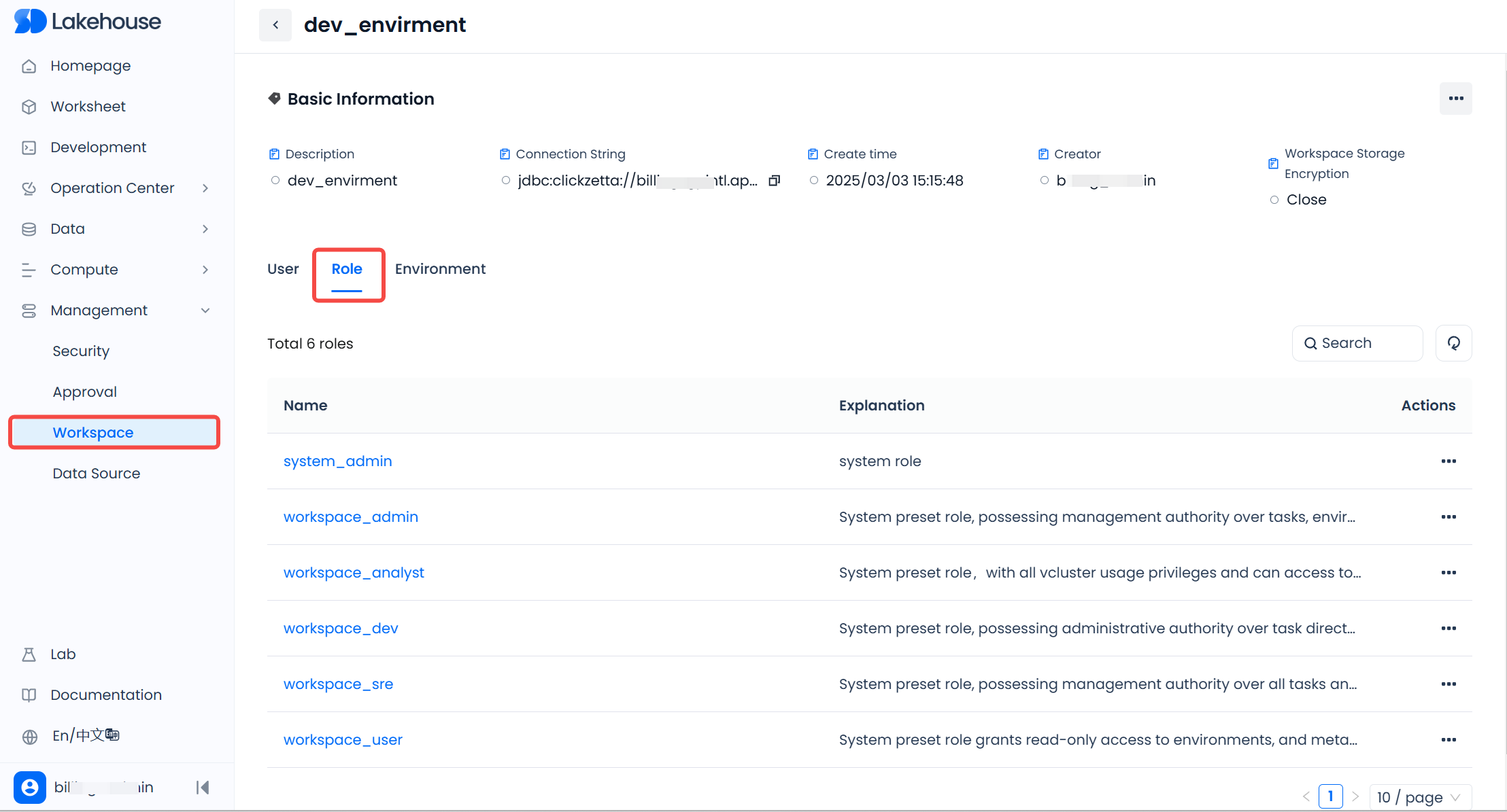 In the "Management" - "Workspace" list, enter the workspace details page, and on the "Roles" tab, you can also view the list of roles in the workspace and grant or revoke roles for users through the above operations.