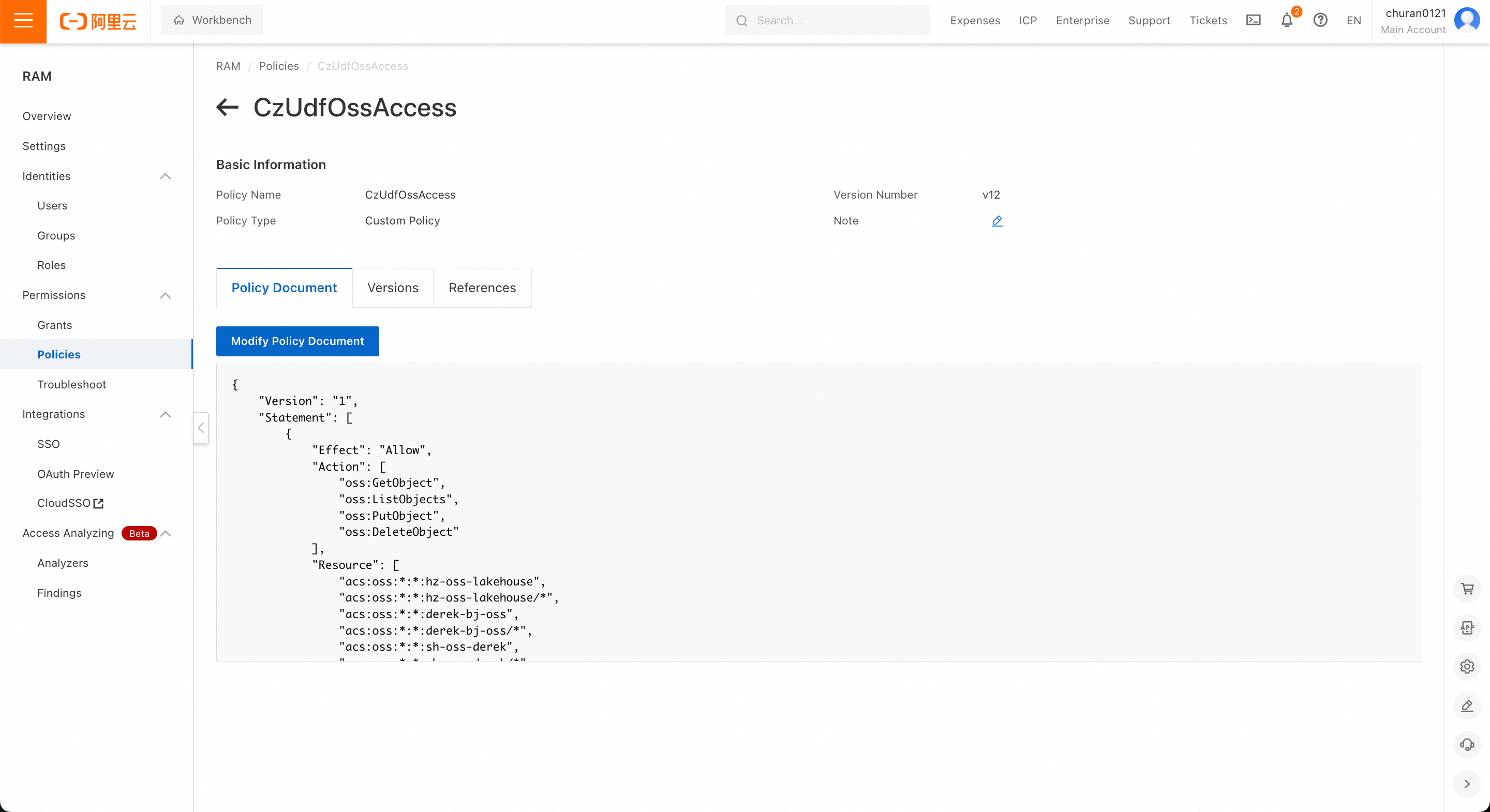 1. Operations on the Alibaba Cloud side: Create a permission policy (CzUdfOssAccess) in the Alibaba Cloud RAM console: