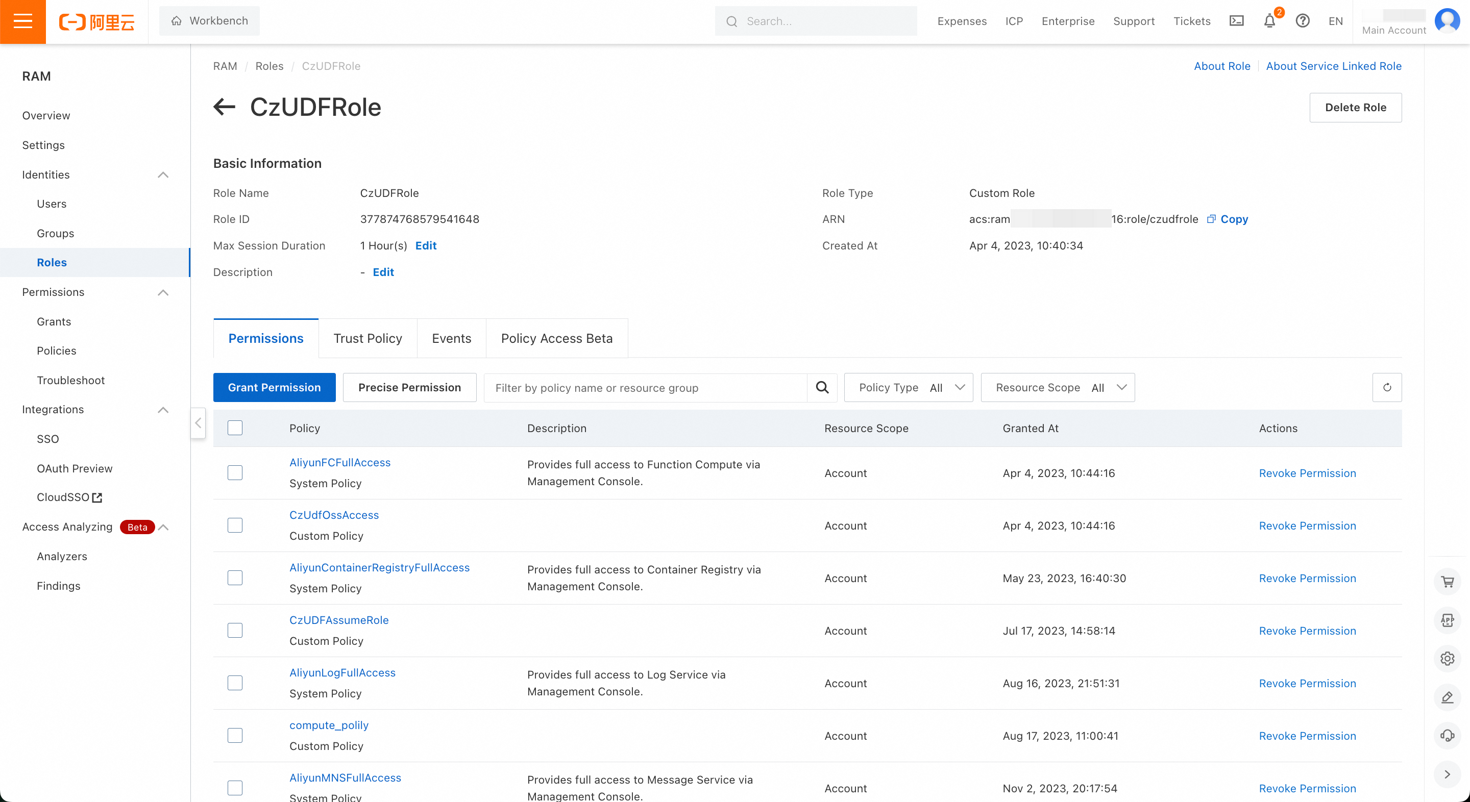 2. Alibaba Cloud Side: Create a Role CzUDFRole in Alibaba Cloud RAM: