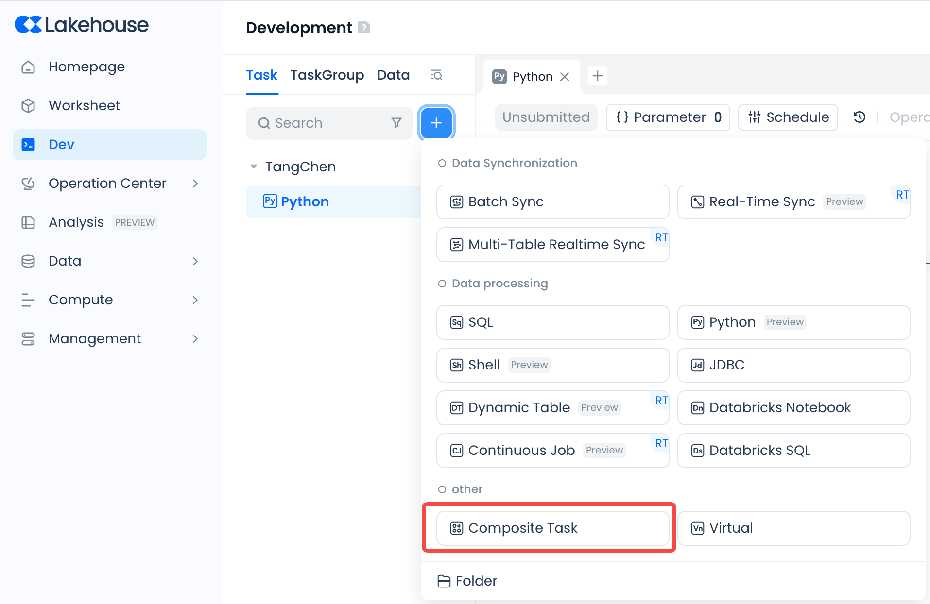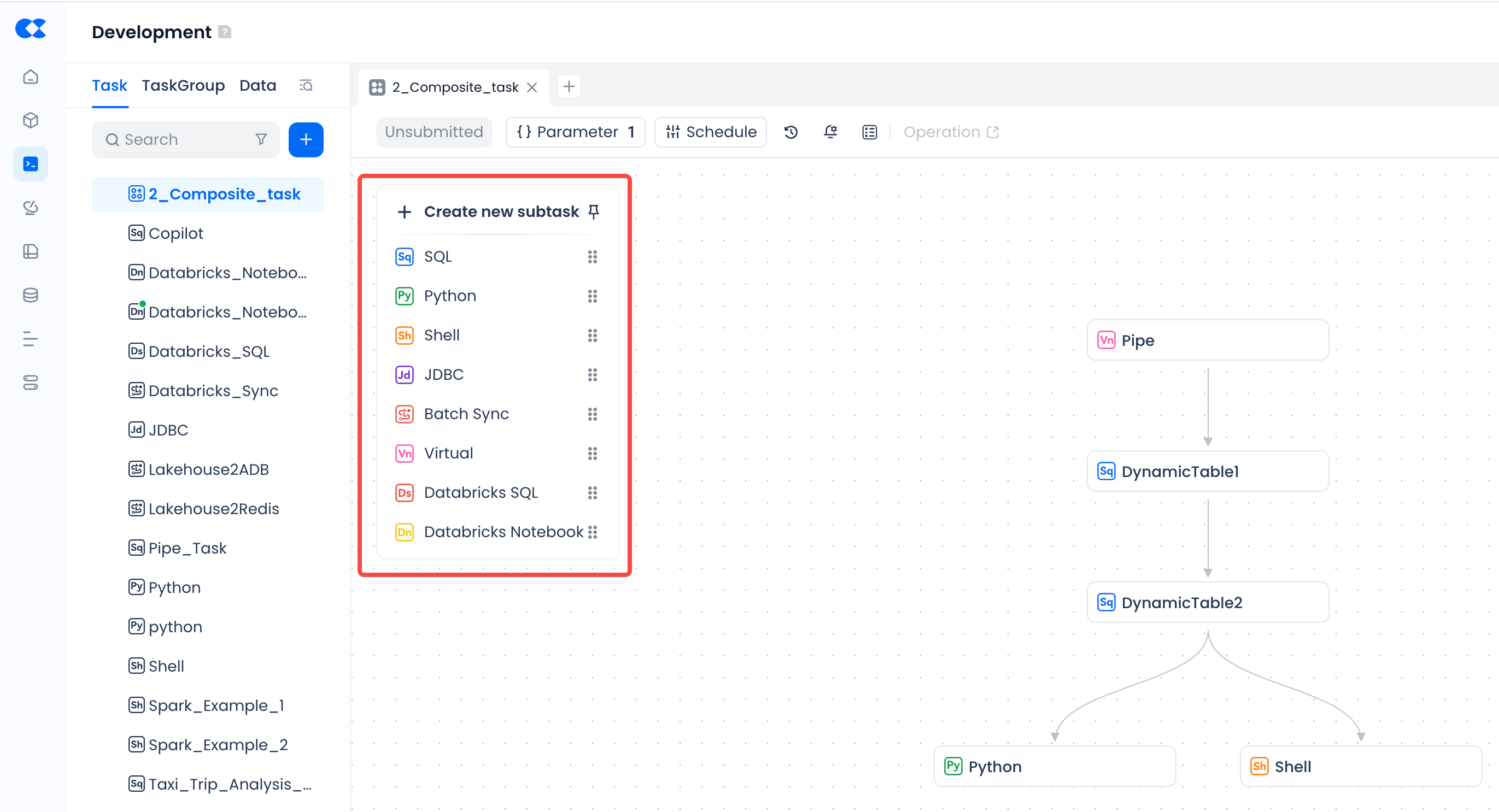 - Composite tasks currently do not support global unified saving of subtask nodes. Please operate on individual subtasks to ensure code, scheduling configuration, and other information are saved before submitting the composite task.