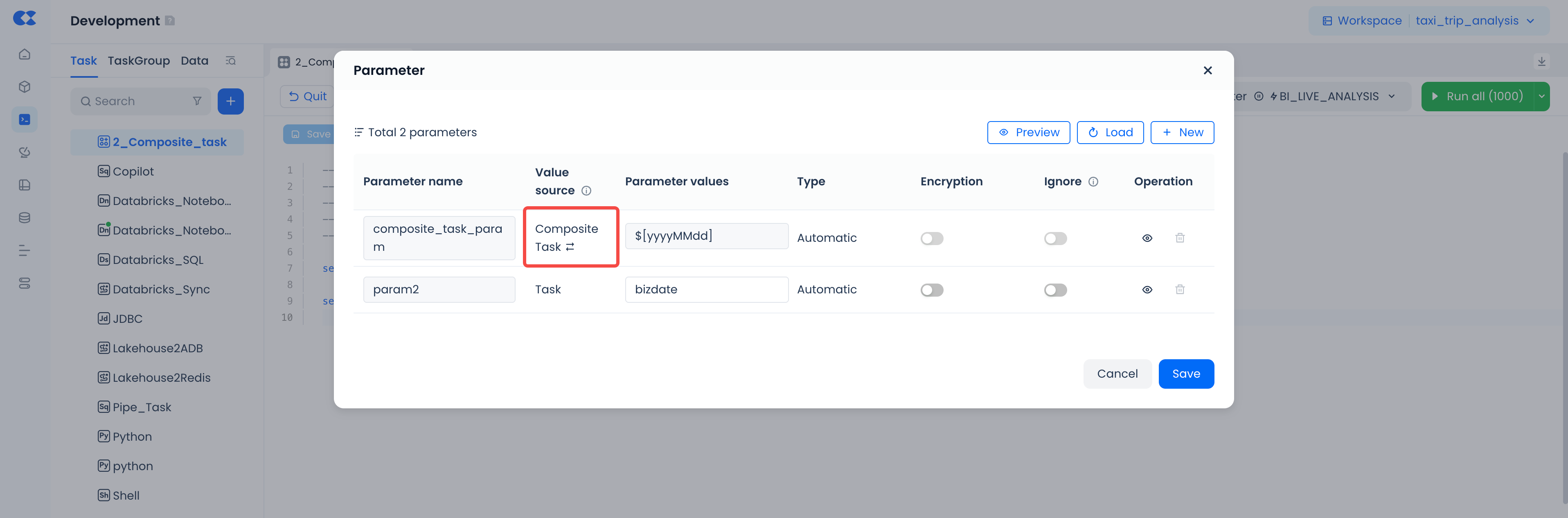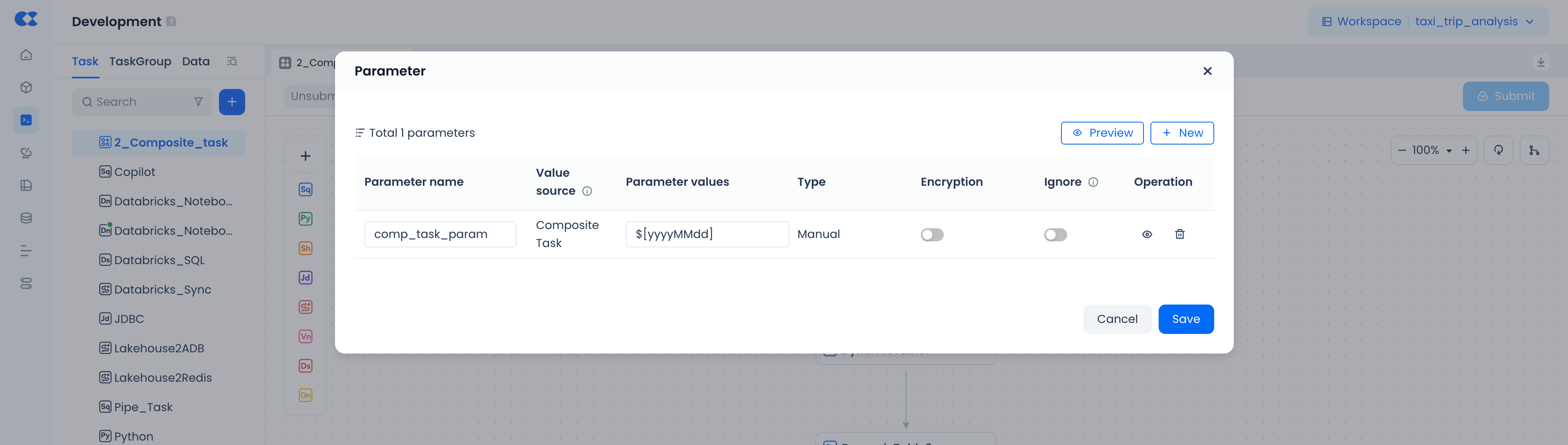 Entry Point: Composite Task Details Page → Click "Parameters" → Add parameters in the dialog (e.g.,