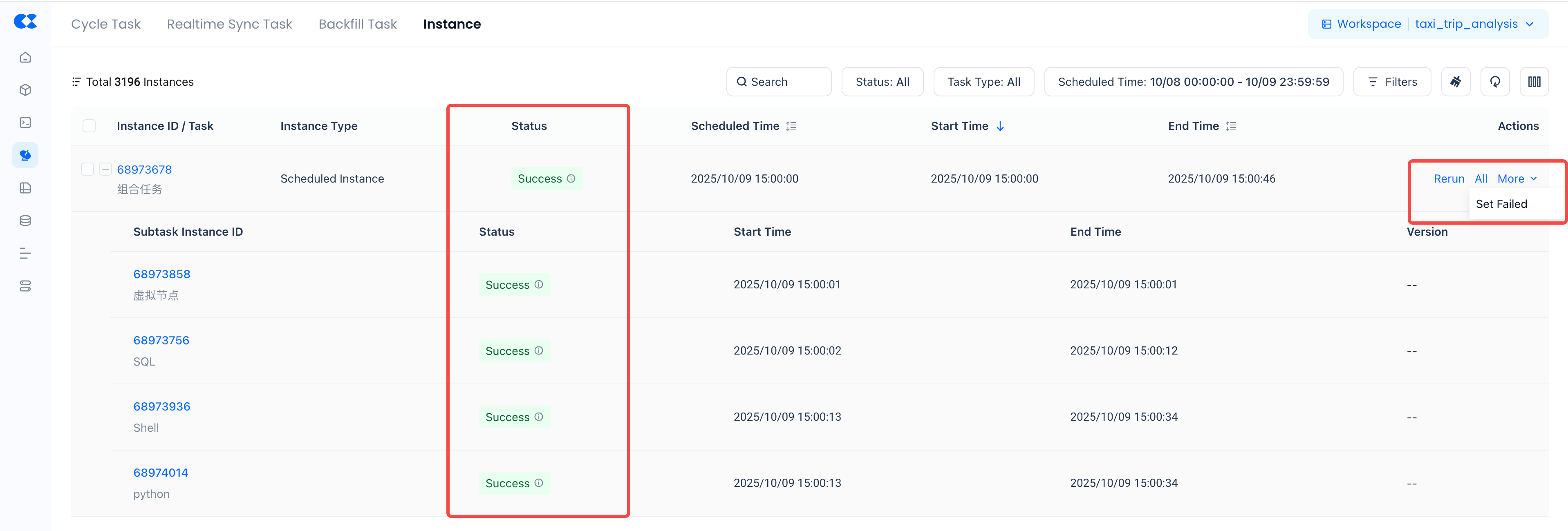 In the Instance Operations tab, composite task instances can be viewed alongside other periodic task instances, with support for operations such as rerun and mark as failed, as shown below: