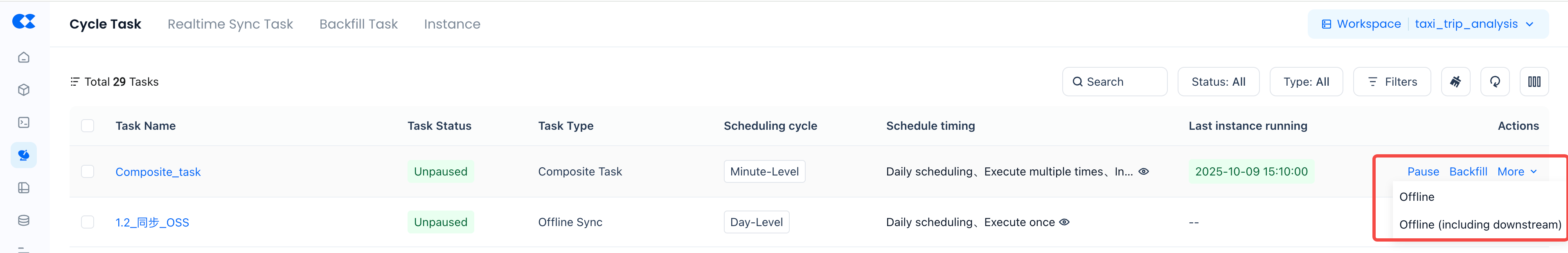 | Offline | After going offline, the task no longer schedules; check for downstream dependencies (cannot go offline if downstream exists; use offline with downstream functionality instead) |