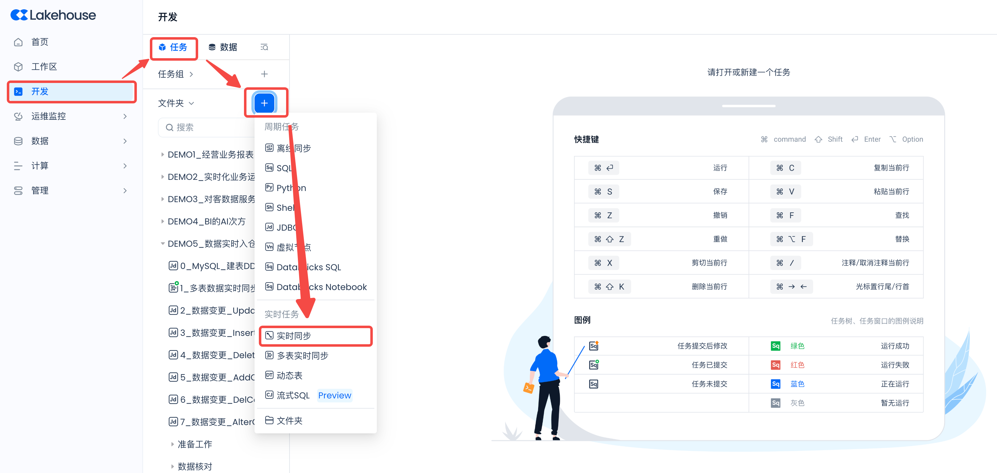 Navigate to Development -> Tasks, click "+", select "Real-time Sync", and create a new "Real-time Sync" job.
