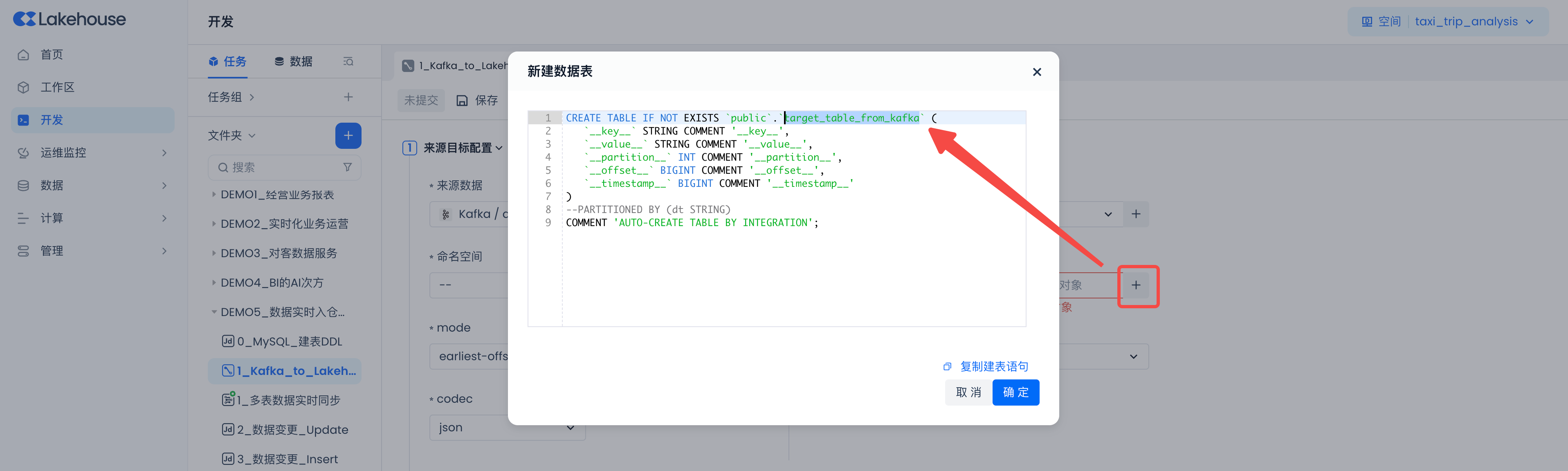 In the "Create Data Table" SQL code, change the table name to "target_table_from_kafka".