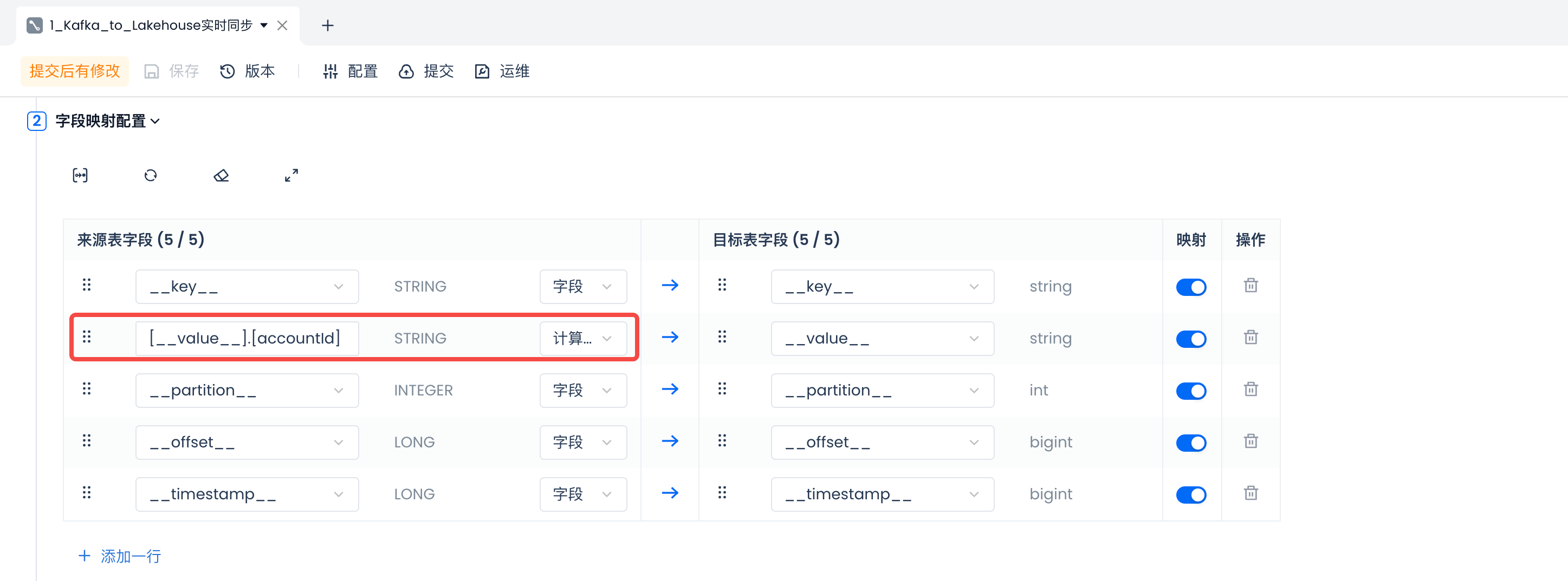 In the "Field Mapping Configuration" area, Kafka Topic built-in fields will be used for data field mapping by default. If the message format in the Topic is JSON, you can also use the new calculated column method to parse the content in the value field using JSONPath rules. For example, extract the accountId field in the __value__ from the source topic and write it into the target __value__ field as shown in the figure below.