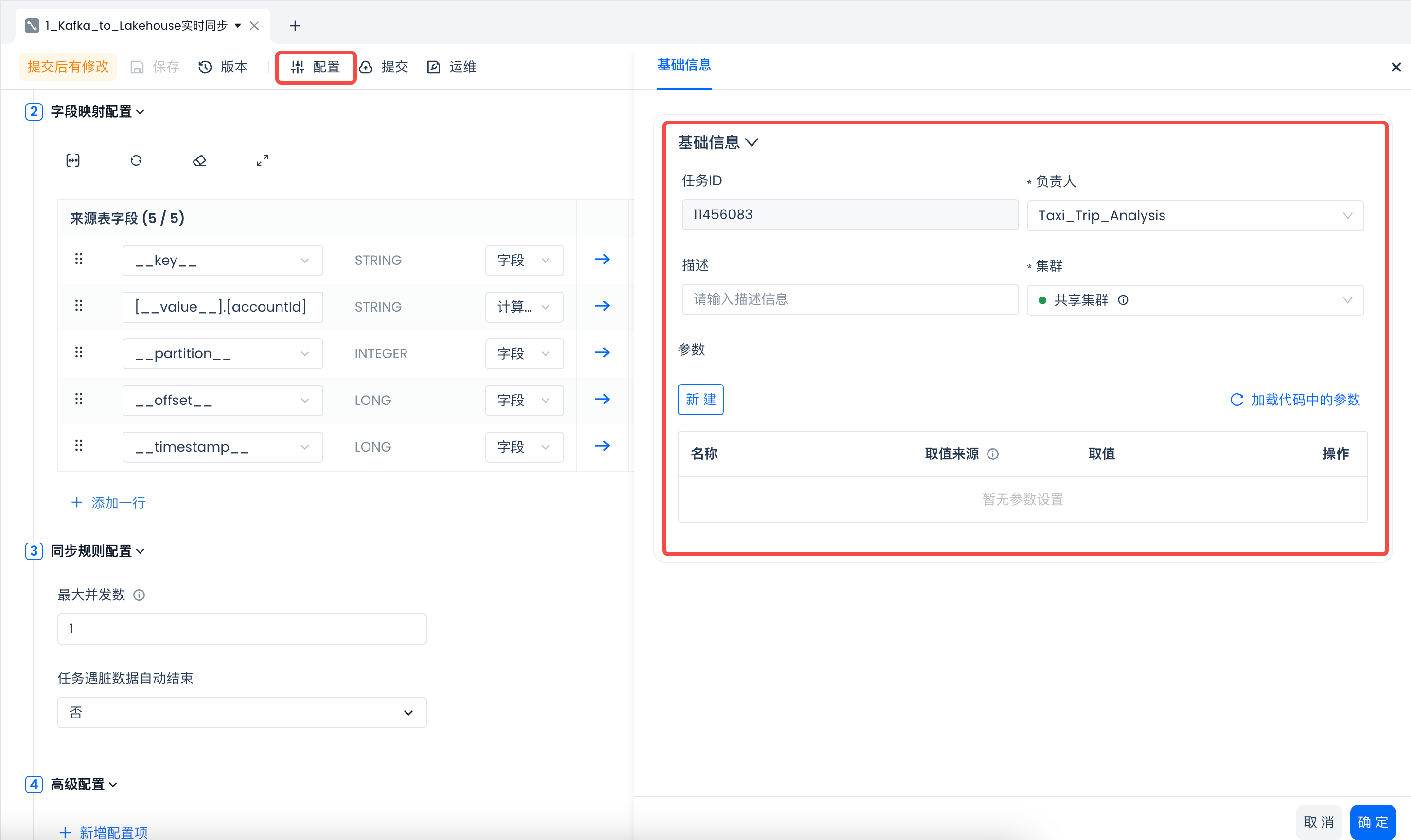 After checking that the field mapping meets expectations, set the required information such as "Cluster" in the configuration, click "OK", and then click "Save" to save the task configuration.