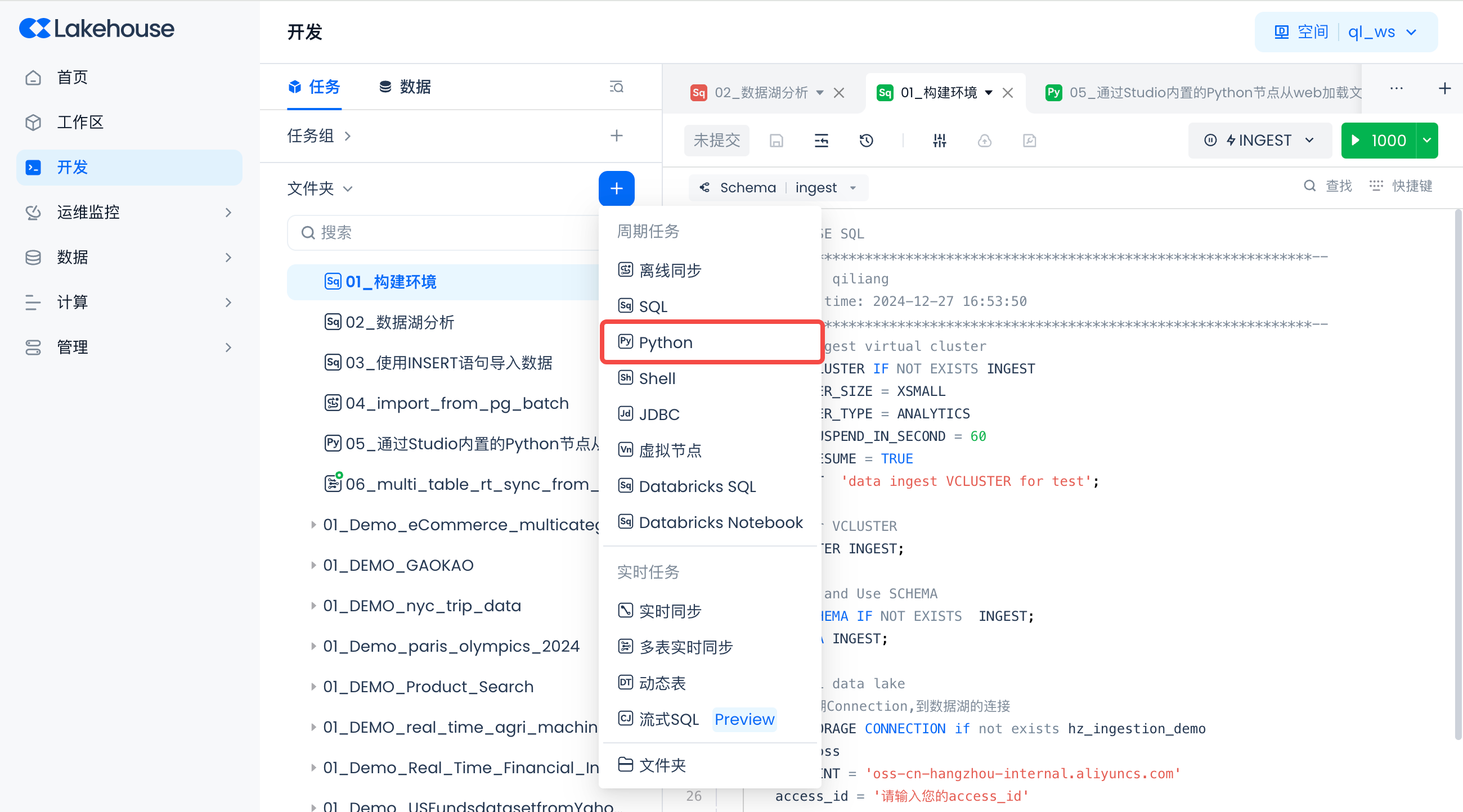 Singdata Lakehouse Studio comes with a built-in Python node that allows you to develop and run Python code.