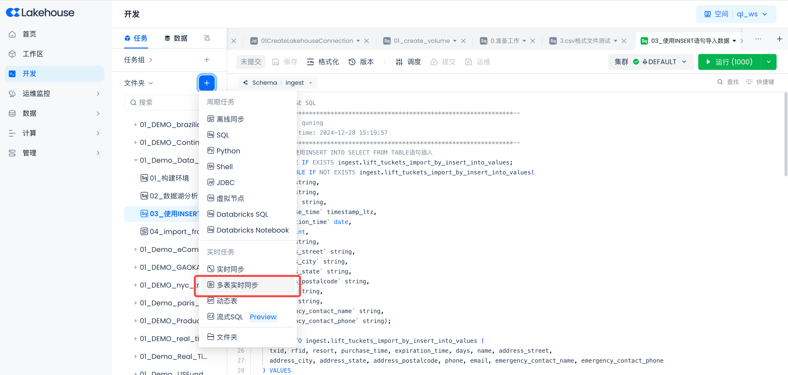 Navigate to Development -> Tasks, click "+", select "Real-time Multi-table Synchronization", and create a new real-time multi-table synchronization task.