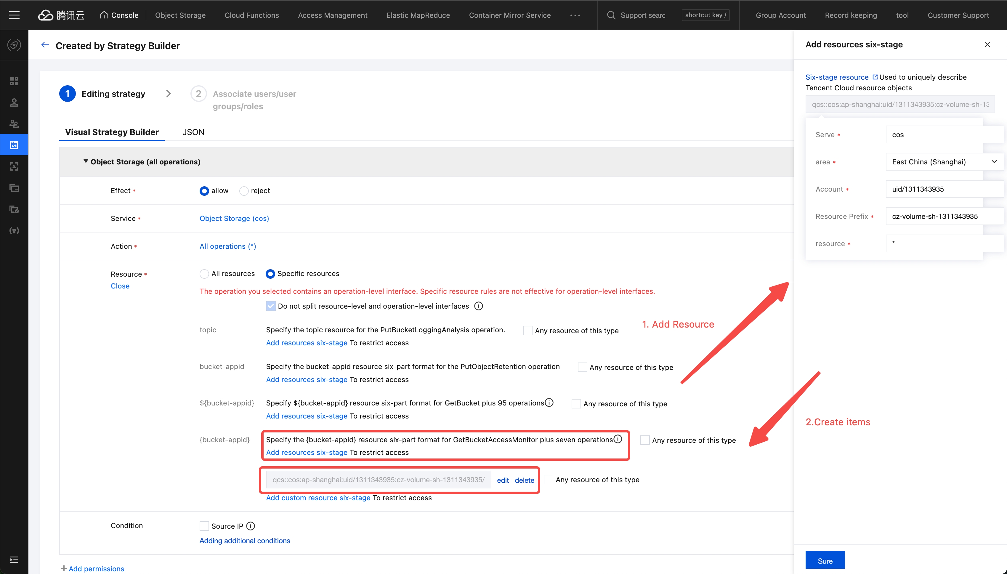 - In the Visual Policy Generator tab: Service: Select Object Storage (cos); Action: Select All Actions (you can make more granular selections based on actual needs); Resource: Select All Resources or Specific Resources as needed. In this example, select specific resources for the Shanghai region
