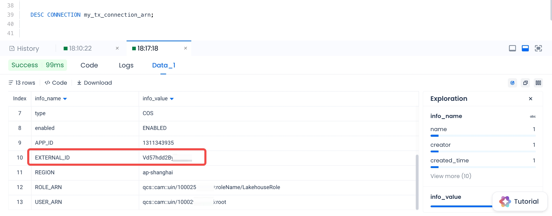 - During the process of creating a storage connection, Lakehouse will generate this EXTERNAL ID, which can be configured into the role verification of the COS account to achieve access control: