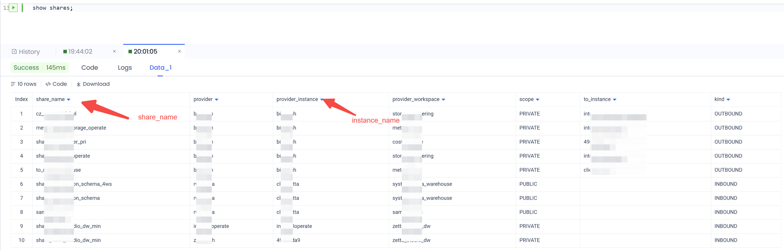 Specifies the name of the share to be extracted. Because different service instances might share share objects with the same name, you need to prepend the instance name to the share name to identify a unique share object accurately. You can obtain this information by executing the SHOW SHARES; statement as a user with either the instance_admin or workspace_admin role.