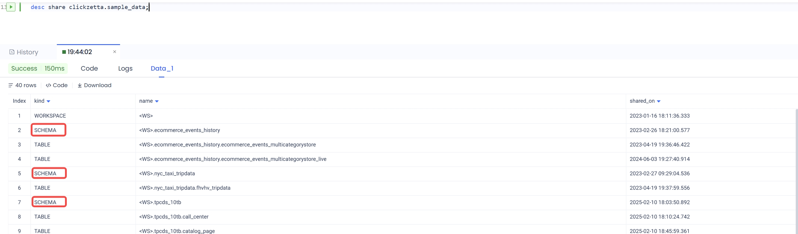 schema_name Indicates the data to be extracted, on a schema-by-schema basis. After execution, the data objects (tables, views, etc.) in new_schema_name will match the data objects in schema_name of the share. Therefore, you need to fill in the schema_name of the share you want to extract.