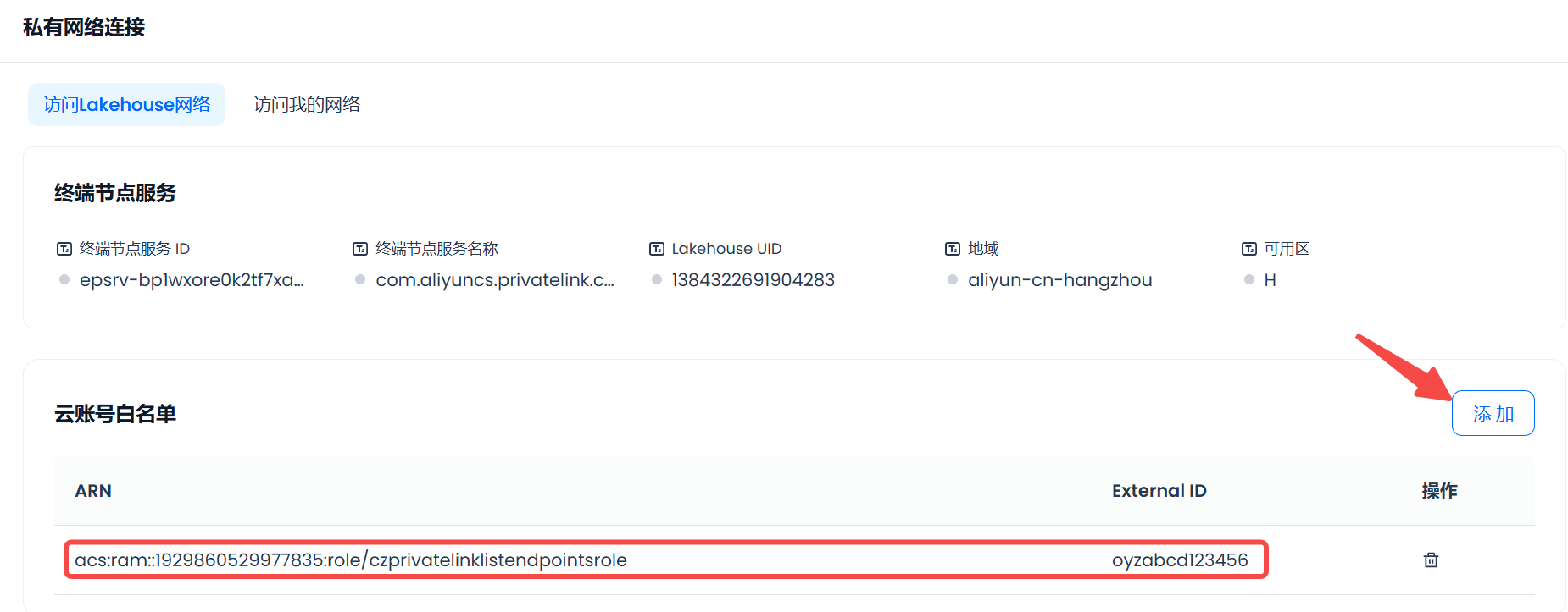 To ensure that Lakehouse can correctly read the status of your endpoint and enhance the security of obtaining endpoint information within your cloud service platform, please create an independent access control role within the cloud service platform, and authorize and add an external ID.
