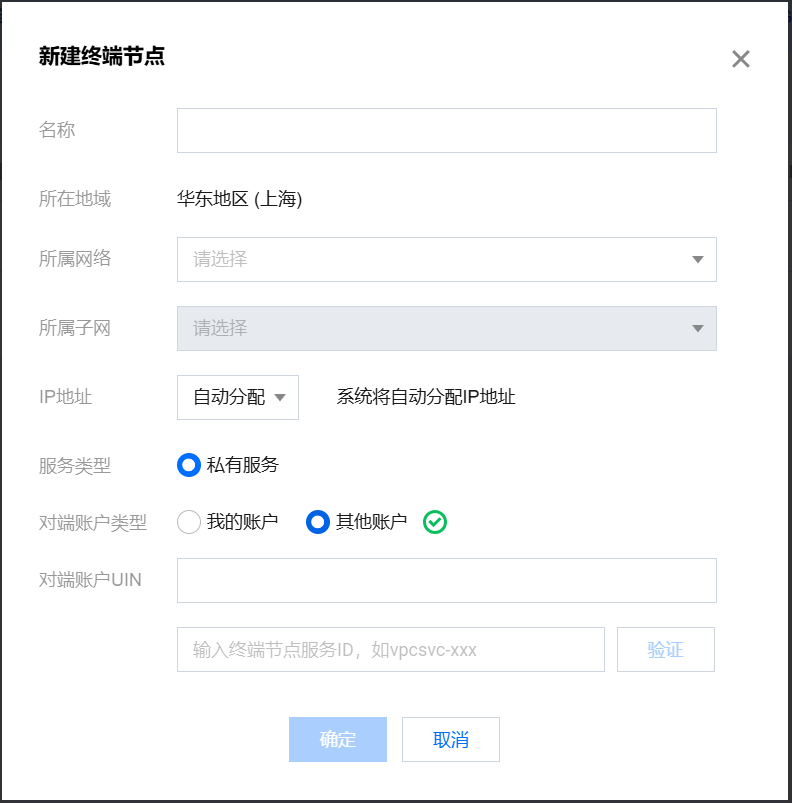 2. Create a New Endpoint. On the endpoint page, click the "New" button, select "Other Account" for "Peer Account Type". Then, in "Peer Account UIN" and "Peer Endpoint Service ID", respectively fill in the "Lakehouse UID" and "Endpoint Service ID" copied from the Lakehouse page. Click "OK".