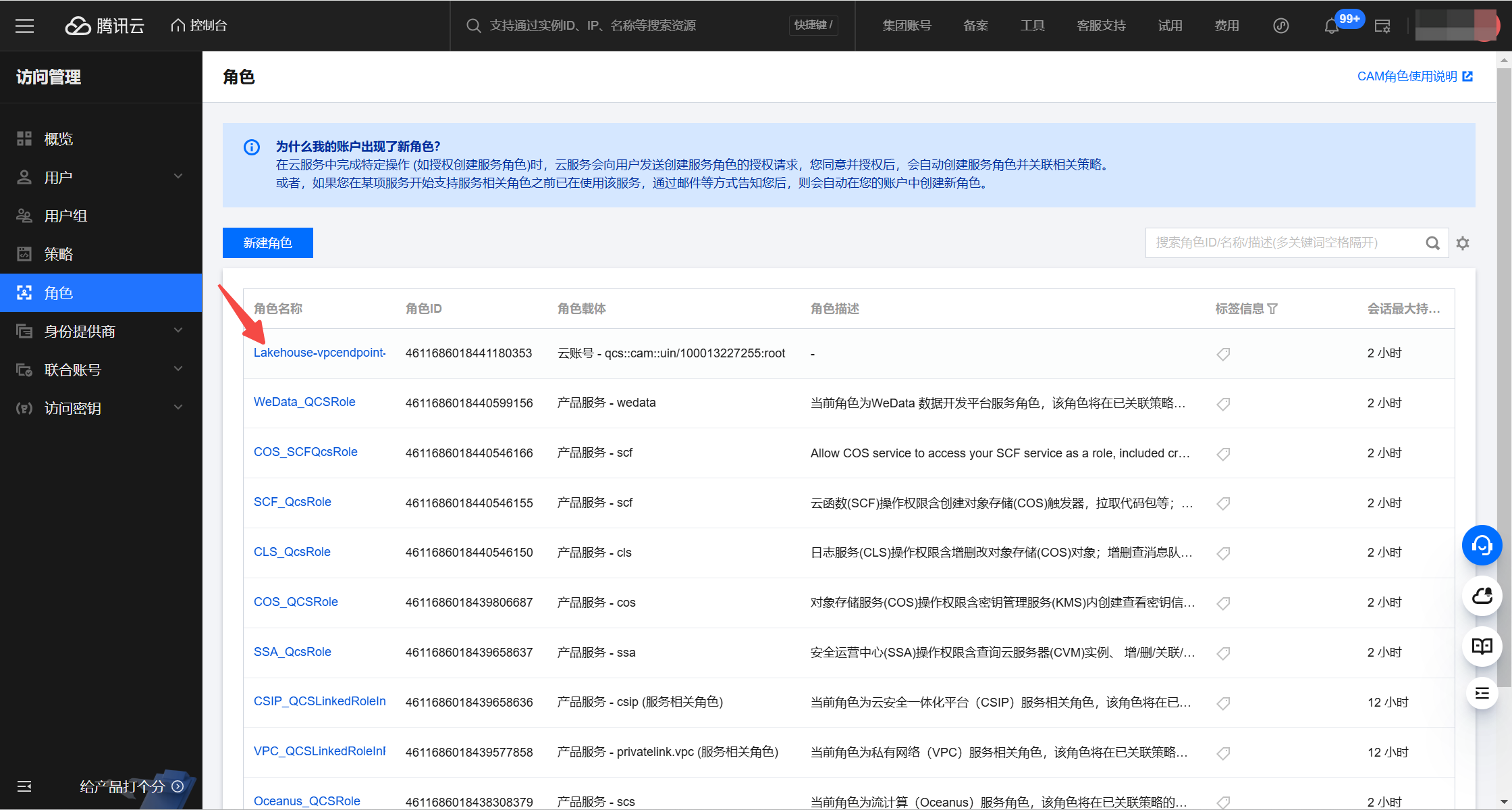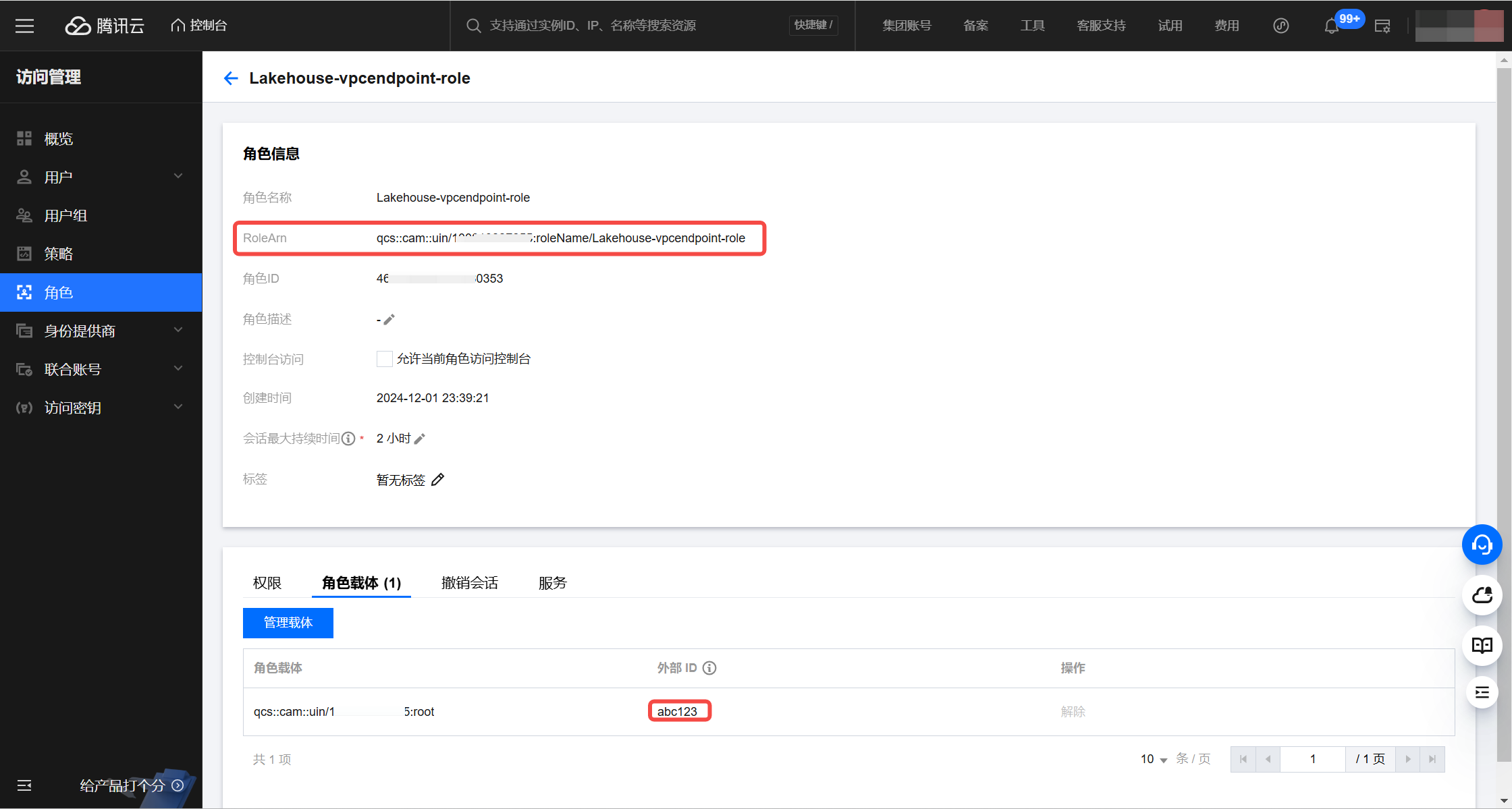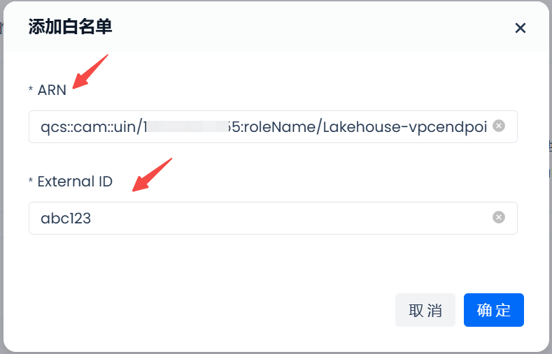 On the Tencent Cloud access control role list page, click the role name you want to add its ARN, and in the role details, select "Role Carrier", respectively copy the "RoleArn" and "External ID" from this page, and return to the Singdata Lakehouse page. In the add whitelist popup, paste the above two items into the corresponding options.