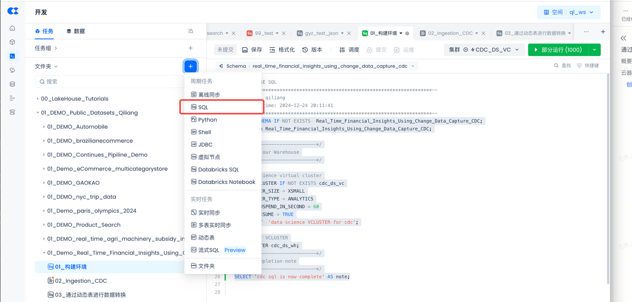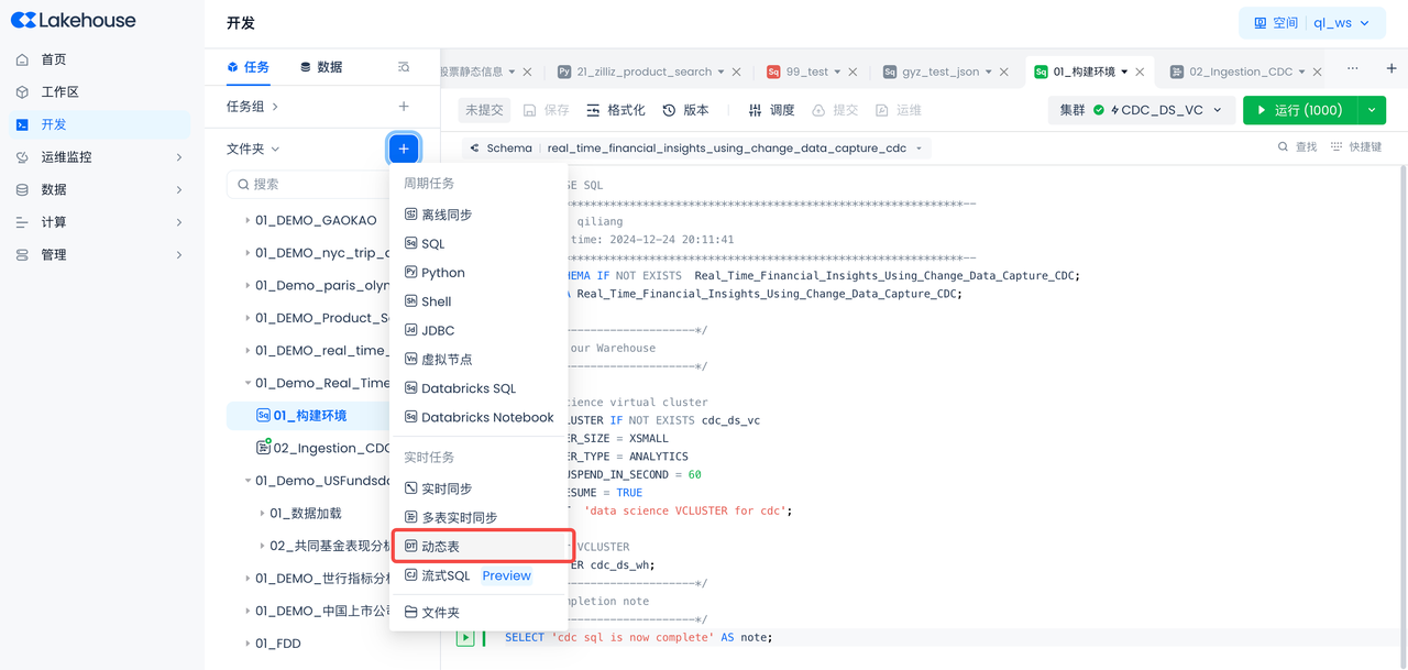 Select the virtual compute cluster "CDC_DS_VS" created in the "Singdata Lakehouse Environment" step.