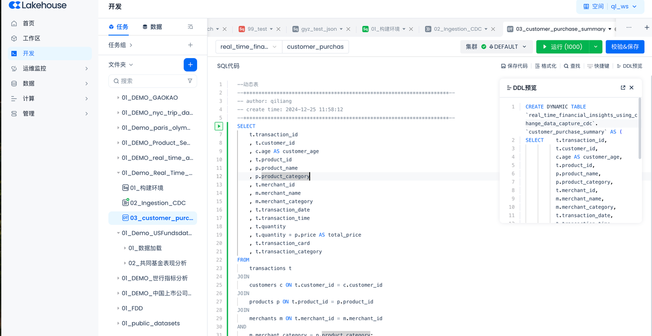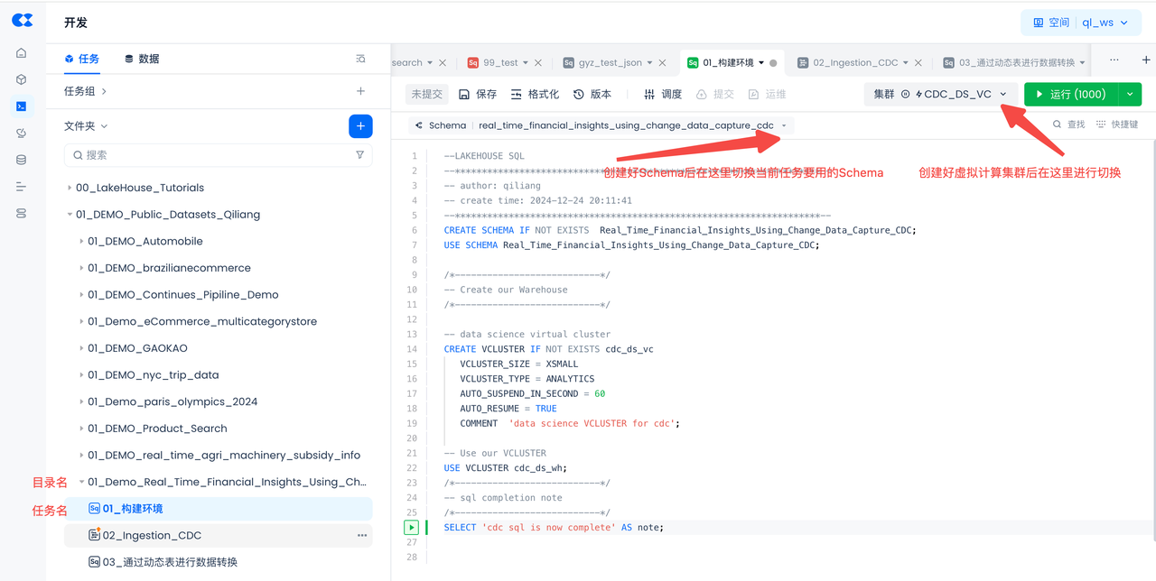 - Copy and paste the following SQL script to create Singdata Lakehouse objects (virtual compute clusters, database schemas), then click "Run" at the top of the worksheet
