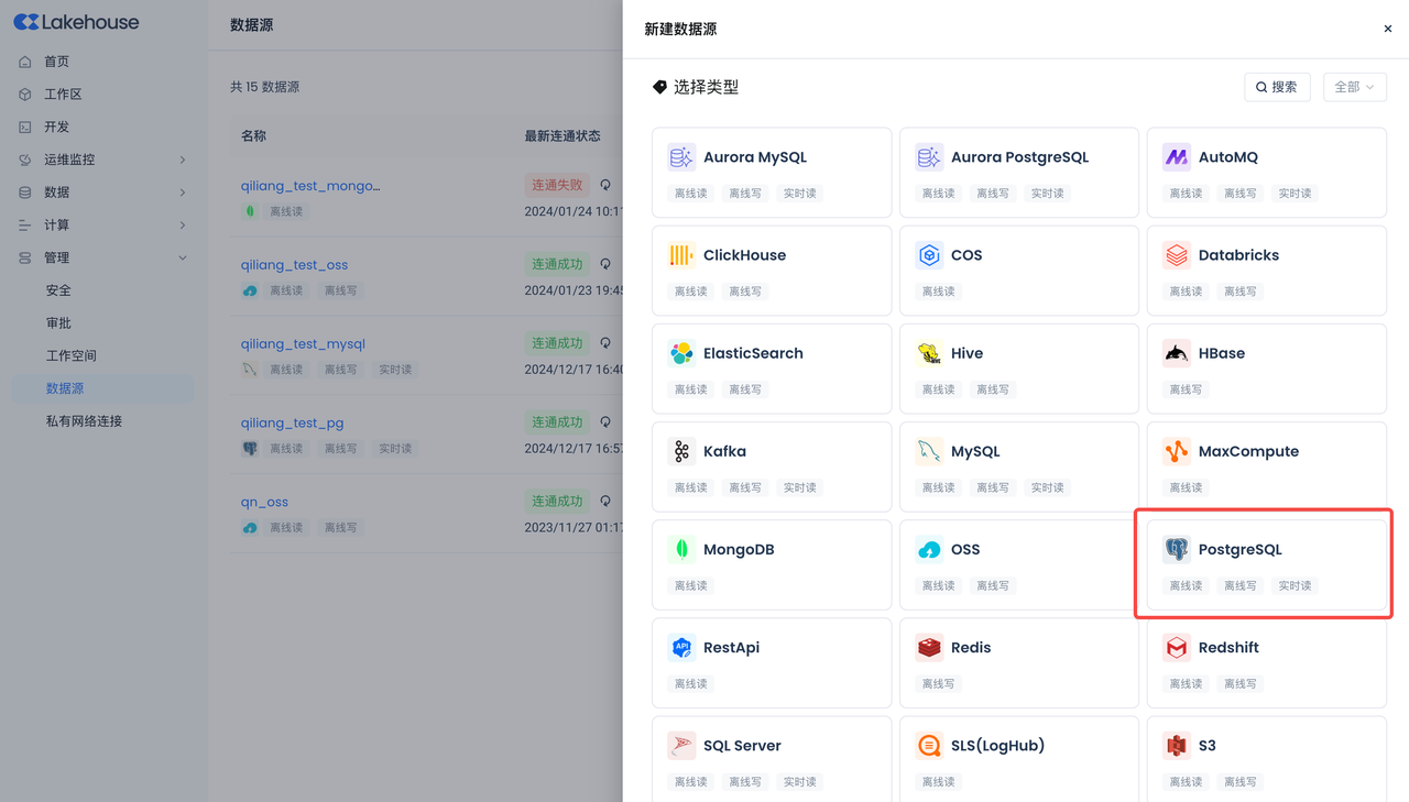 Navigate to Management -> Data Source, click "New Data Source" and select Postgres to create a Postgres data source, making Postgres accessible to Singdata Lakehouse.