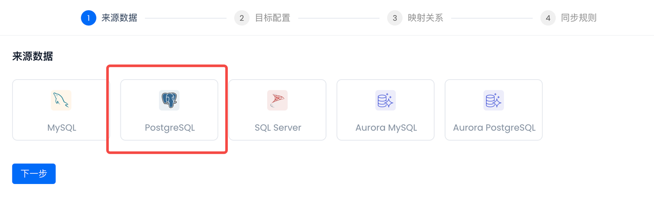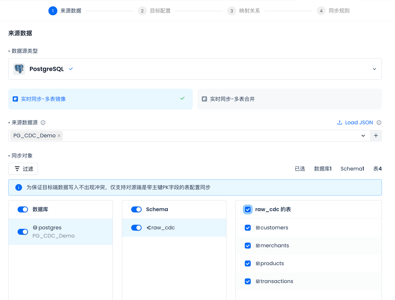 Select the Postgres data source created in the previous step: PG_CDC_DEMO. After selection, the accessible databases, Schema, and tables of the data source will be automatically displayed, and all tables will be selected (all tables need to be synced):